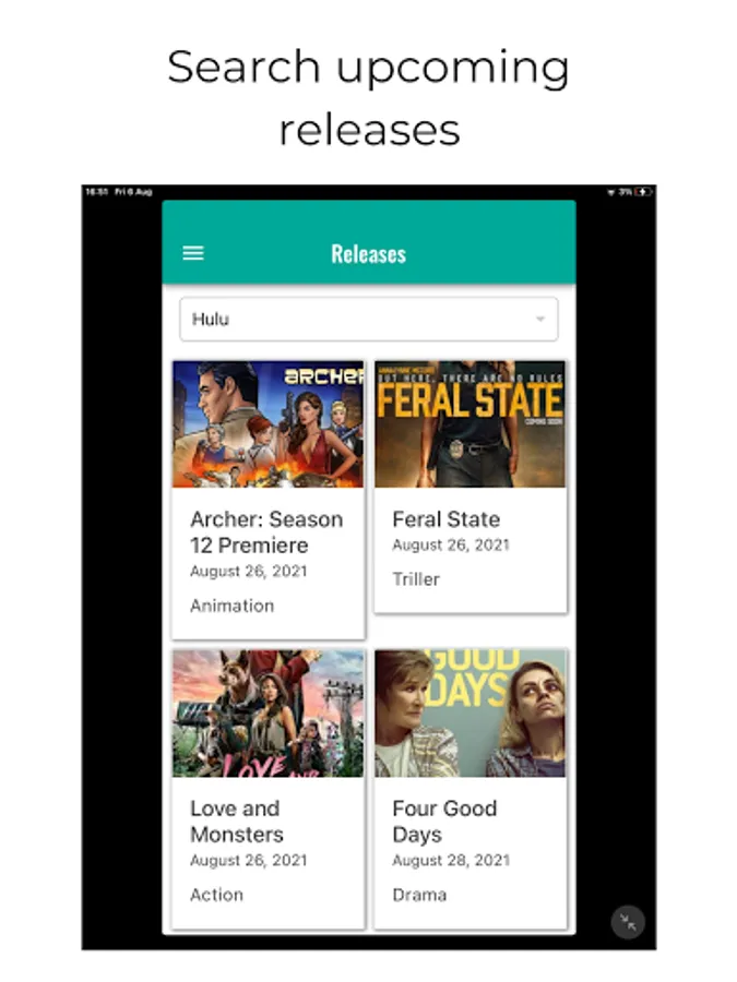 You no longer have to search endlessly for upcoming shows and movies on your favorite streaming services. Quickly discover upcoming releases on on-demand streaming services.