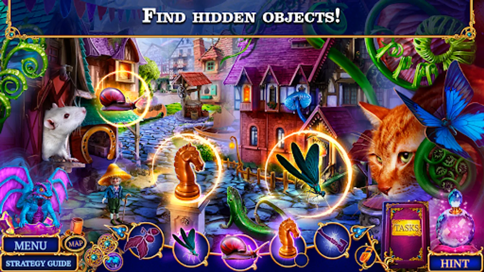 A strategy guide of the hidden objects games helps you with your search and solve puzzles and mini-games with finding object games. You'll always know what to do next! Find hidden objects and dive into this addictive game!