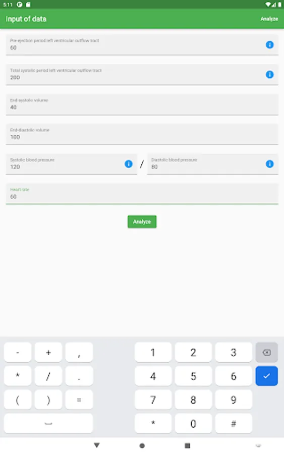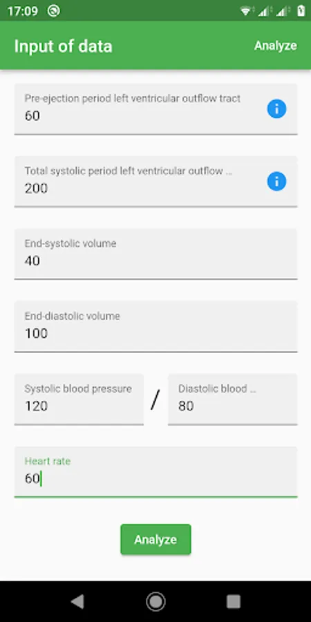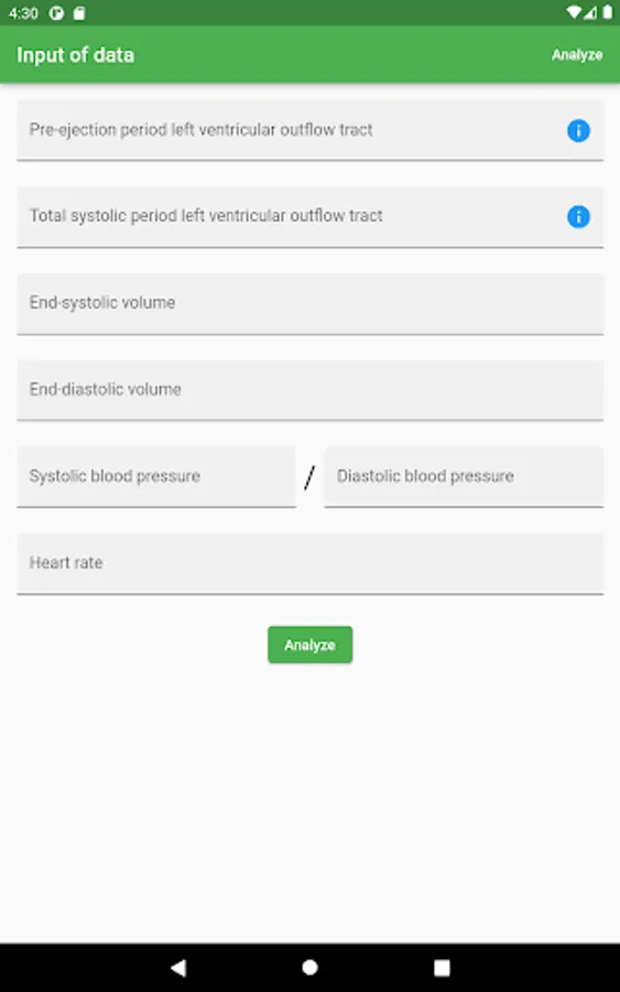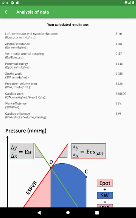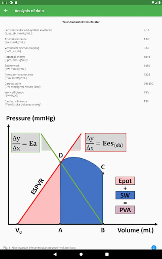 To carry out the analysis, parameters assessed through echocardiography and simultaneous blood pressure measurement are needed. As a result this app provides detailled efficiency parameters of the left ventricle.