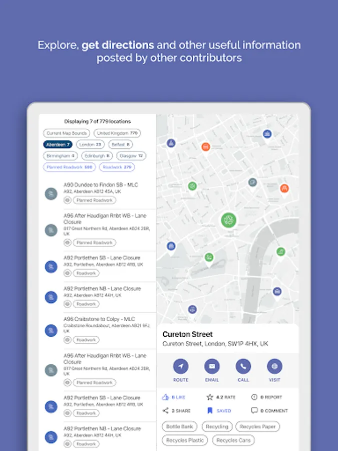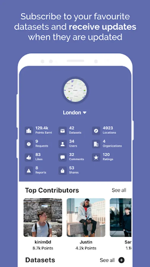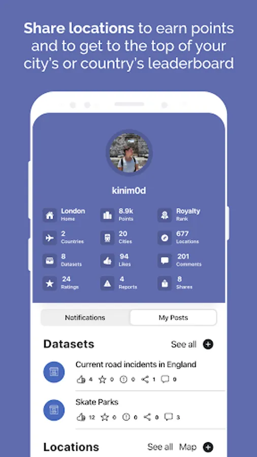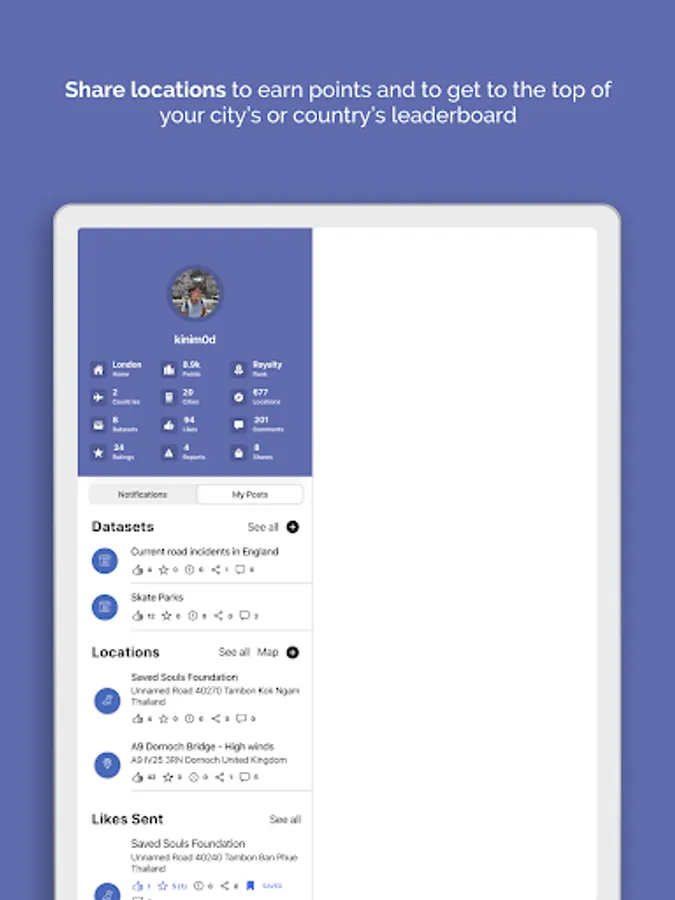 Share locations, paths and polygons with custom fields, styles, categories and features and earn points to move to the top of your city’s leaderboard