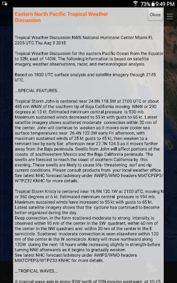 Detailed information on forming and active storms from the National Hurricane Center, covering the Atlantic, East Pacific and Central Pacific.