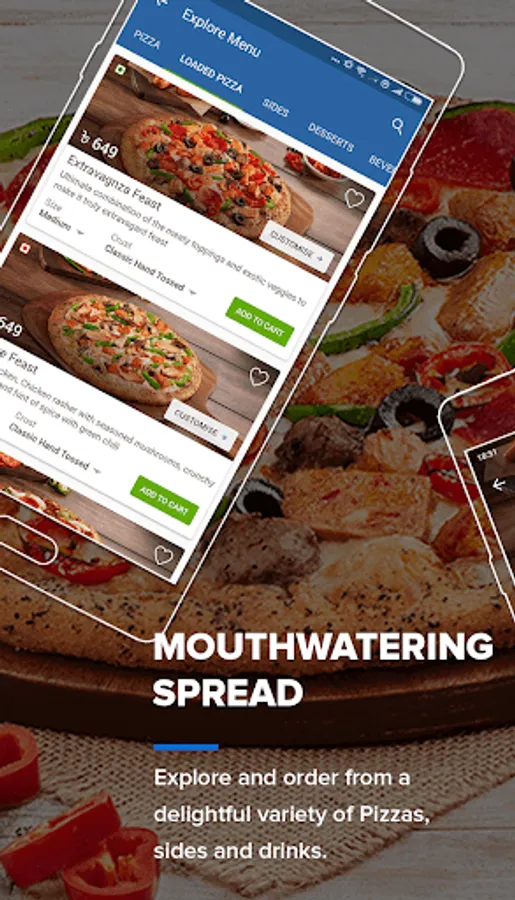 Domino’s pizza delivery app comes with an easy-to-use interface, a quick selection menu, and a smartly designed app-interface that lets you order food online of your choice. Right from the Loaded pizzas to the well-toned chicken stuffed garlic bread, from extra toppings to supplementary beverages, compile the perfect relishing mix within seconds, all on our revolutionary food delivery app. With secure and easy to use payment gateway feasting on your favourite pizza is easy. Save on food order online by using our periodic coupons and find an excuse to order your favourite pizza with attractive offers.