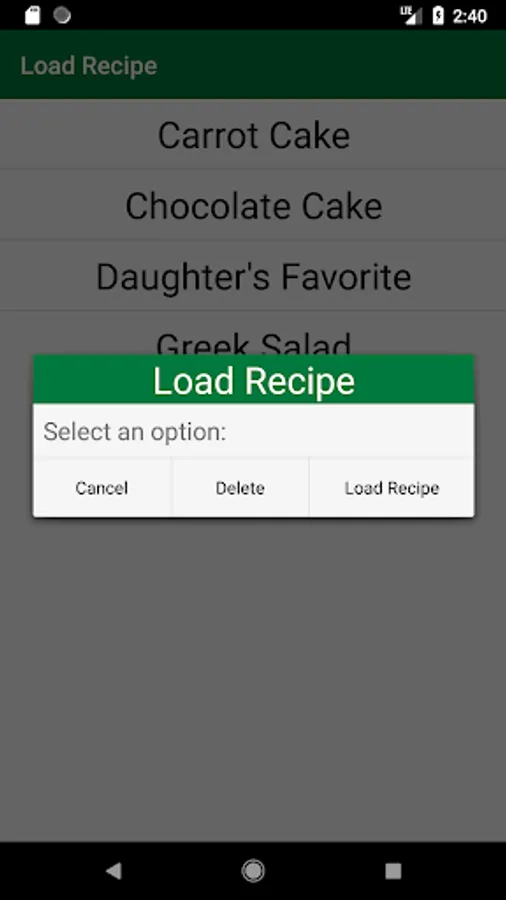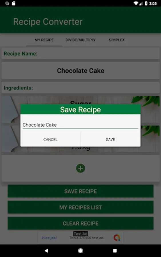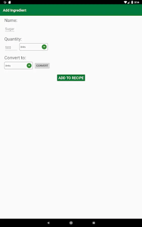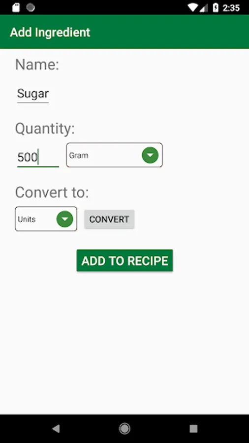 This app allows you to convert individual ingredients, in a recipe, to the desired unit, you can, also, choose a recipe name and then save that recipe with all your ingredients (and all the units you choose) in your phone. Next time you open your app you can just go to "My Recipes List" and find all your recipes there.