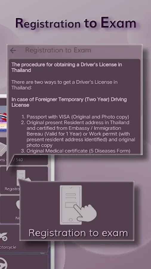 Complete preparation for the exam, various modes, and detailed statistics will help pass the driver's license exam and get a driver's license in Thailand!