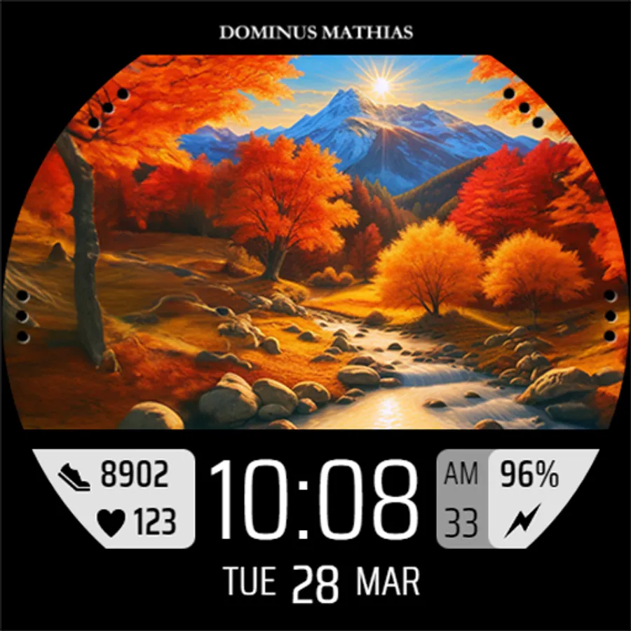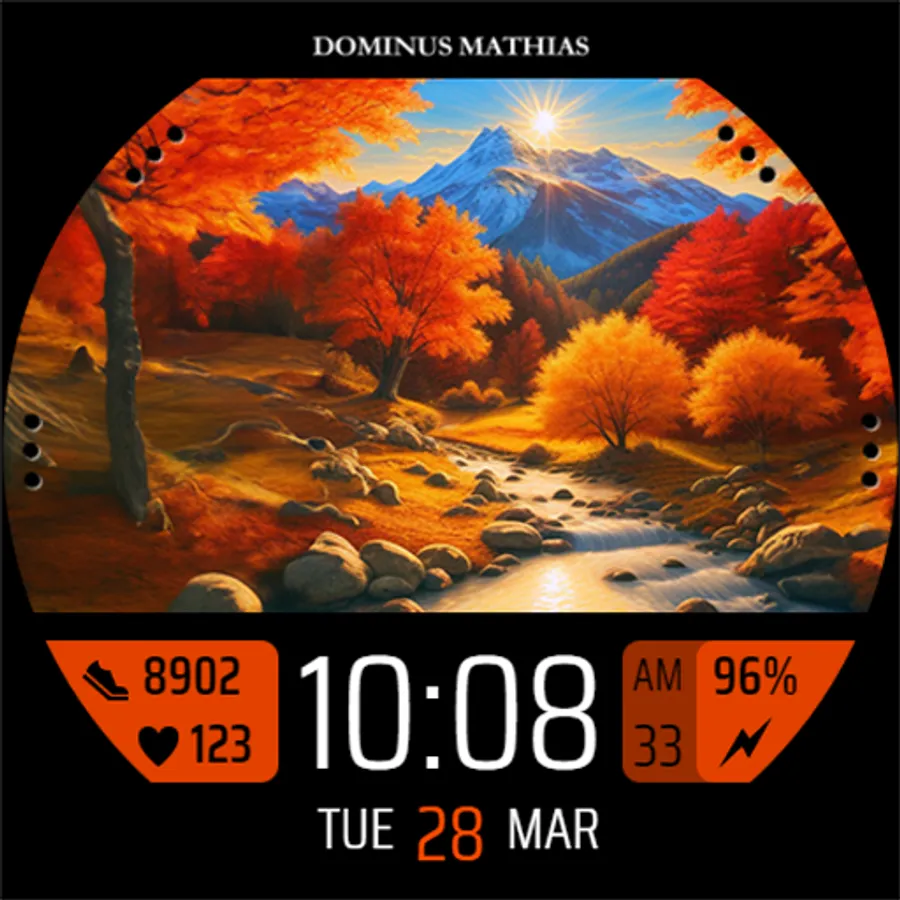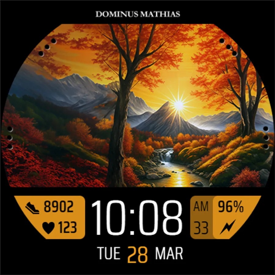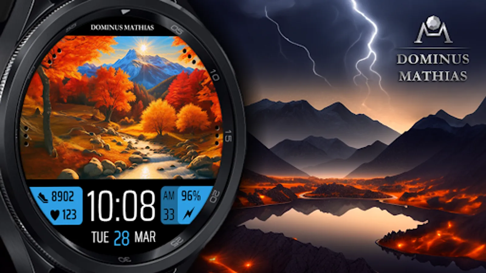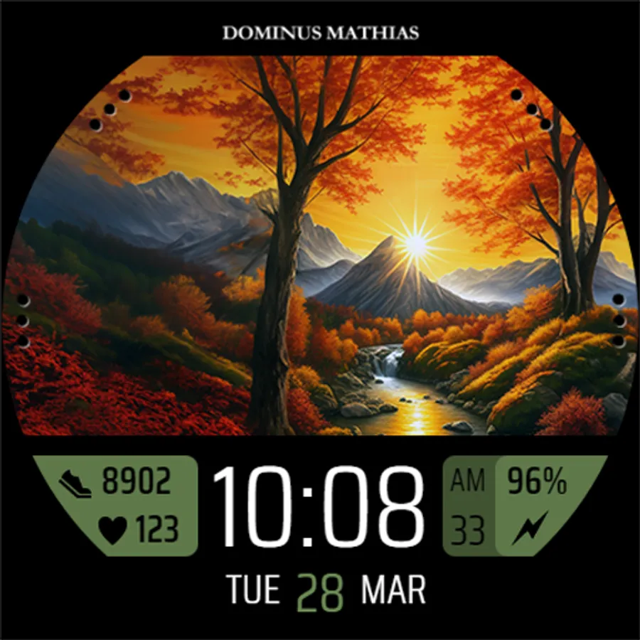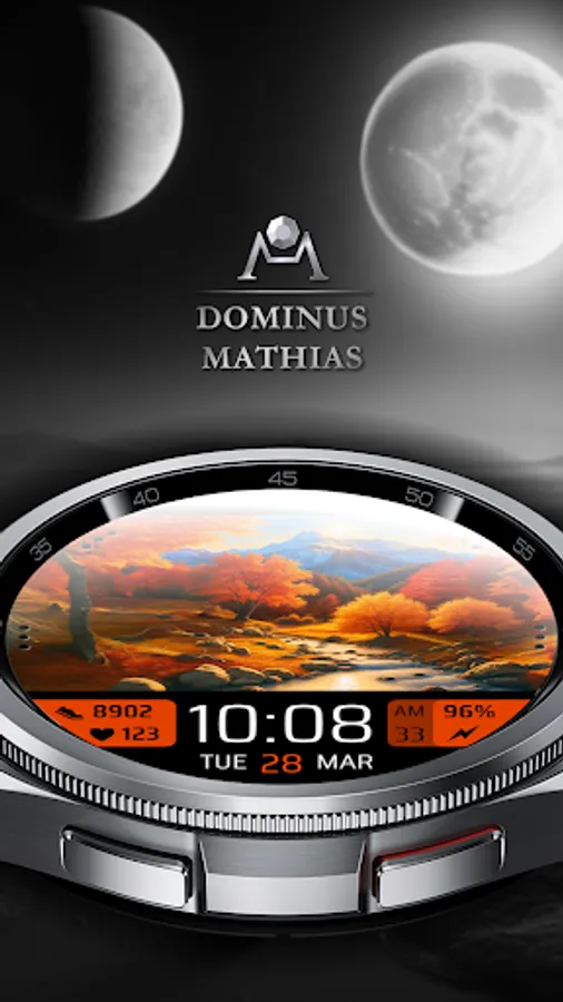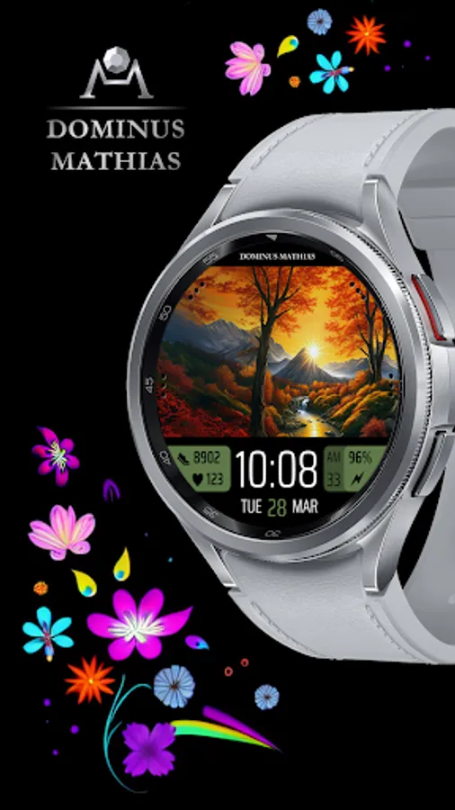 This unique watch face is designed for Wear OS exclusively from Dominus Mathias. Enjoy the real power of this premium model. It contains all the most relevant complications as a big and clear digital time, date (weekday, day in month, month), sport, health & fitness data (steps, heart beat), battery level. The logo Dominus Mathias is placed in the top part. The watch face is easy with 4 complications as a shortcuts for launching of desired applications. You can select between White, Gray, Blue, Green, Red etc. colors.