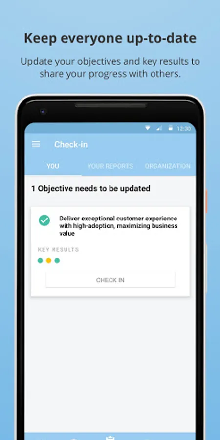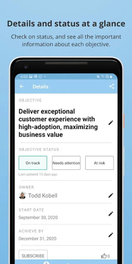 - View your organization’s objectives and quickly see how individual work is contributing.