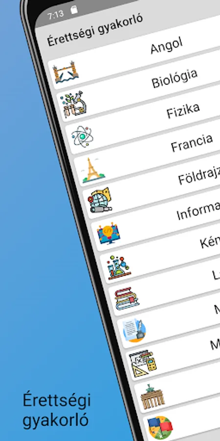 In the Graduation Practice application, you can view the graduation series and solutions of previous years from English, biology, physics, geography, informatics, chemistry, Latin, Hungarian, mathematics, German, and history subjects.
