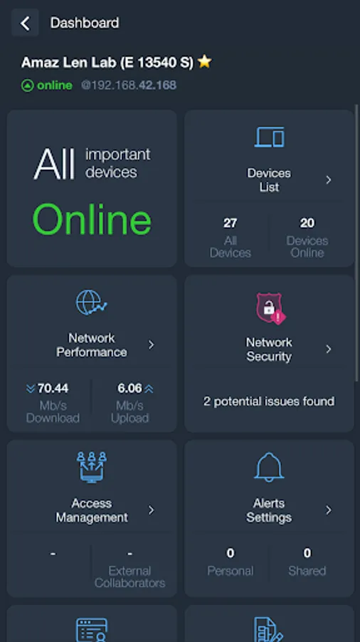 • ALERTS: Email and push notification alerts for network down, device down and new device joined the network.