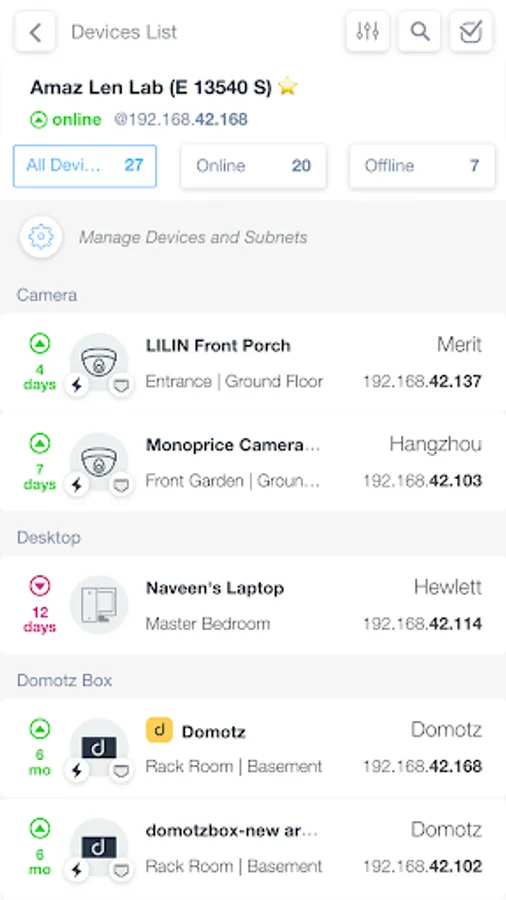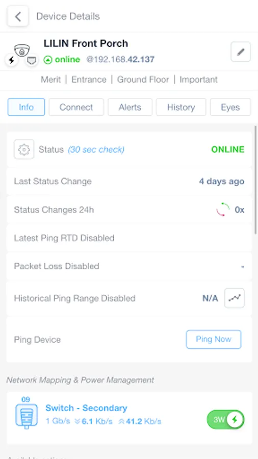 • NETWORK MONITORING: Get a full inventory of all IP devices connected to a network in seconds. Monitoring performed via MAC address and device heartbeat checked every 30 seconds.