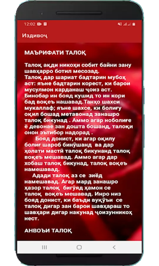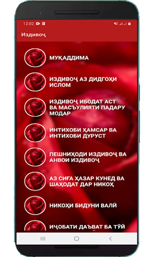 1. Muqaddima. 2. Izdivoҷ az didgohi islom. 3. Izdivoҷ ibodat ast va masuliyati padar modar. 4. Intihobi hamsar va intihobi durust. 5. Peshnihodi izdivoҷ va anvoi izdivoҷ. 6. Az siғa khazar kuned va shahodat dar nikoh. 7.Nikohi biduni wali. 8. Iҷobati davat ba tuy va davat ruzador. 9. Dodobi ta'om khurdan. 10. Duoyi khair dar haqi sohiboni khairot. 11. Duoho dar tuyho va izdivogi manu harom. 12. Marifati mahr. 13. Makhri norava va nakhustshabi izdivoҷ va nafaka. 14.hukuqi shavhar boloi zan. 15. Hukuqi zan boloi shavhar. 16. qukmi khidmati head of bar head. 17. Qissai ibratomez. 18. Az moli shavhar sadaka kardani hamsar.