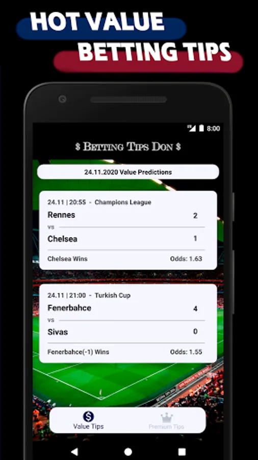 With the football data we analyze everyday you will receive the most analyzed football, tennis and basketball betting tips each day even when the fixtures are not even great. With features like Hot(High Odds Tips), Value betting tips(Best ROI predictions) and Premium Tips Don Betting Tips app ready to help you with your bet picks.