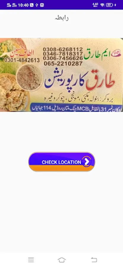 • For users , Items for sale are Cotton Seed or Banola, Sunflower, All types of Rice, Wheat, Lint(Roi), Corn, Soya been etc. & if user want to purchase these items then he will contact with the Tariq Corporation through their mobile numbers, also will see bank account numbers through App & will feel friendly environment to send money through these account numbers without any tension. Actually, I want to brought in your kind knowledge that money movement is not involved in between app.