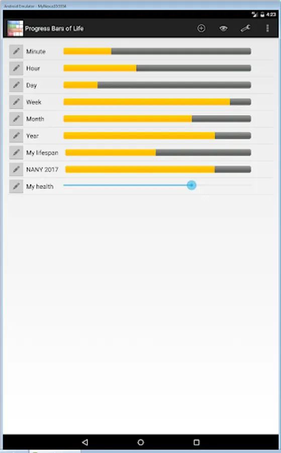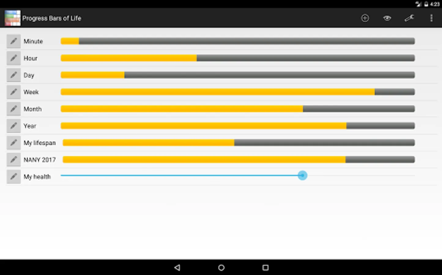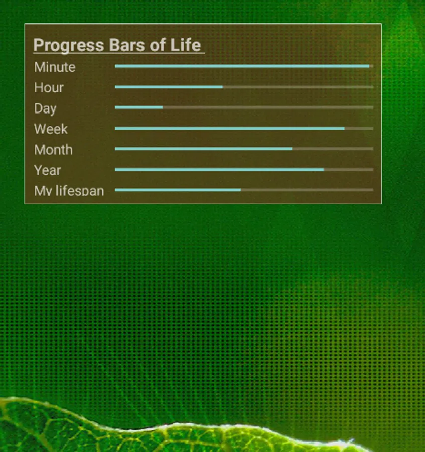 Create groups of progress bars that track the time remaining for events in various ways. Show bars for time remaining in current hour, day, week, month, year, until holidays or birthdays or deadlines.