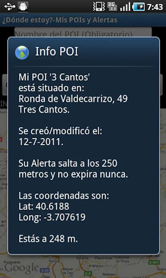 7. These POIs can also be configured with proximity alert (you select the radious in meters and if the alert must expire and when). The alert warns you with a message and device vibration. Also you are warned when you exit the radius.
