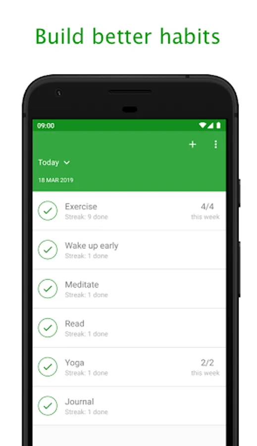 Track when your habits are done, create streaks and watch your habits grow over time. Developing the right habits is key to living a happier and more successful life.