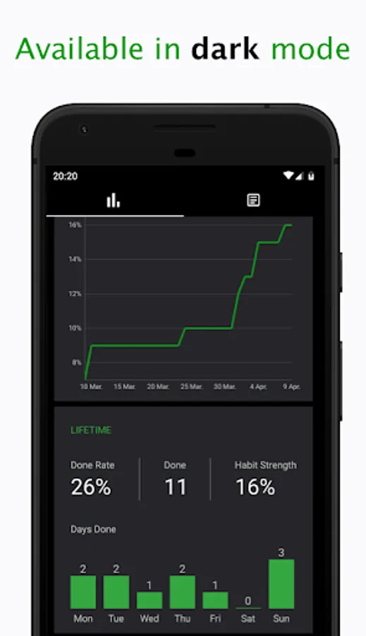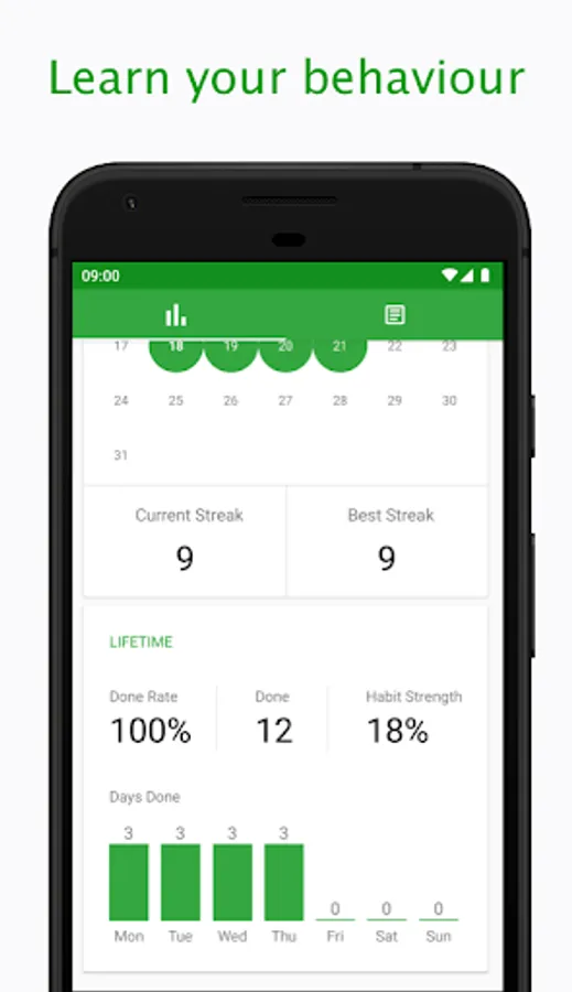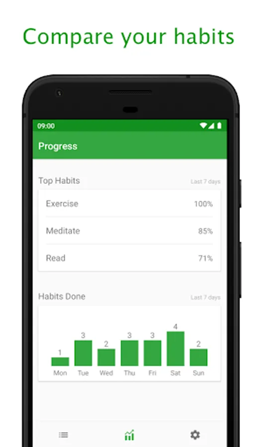 Get insights into your habit streaks, your more successful days and how many times you done a habit since the beginning. Easily compare across all your habits to spot trends and see which habits are outperforming the others.