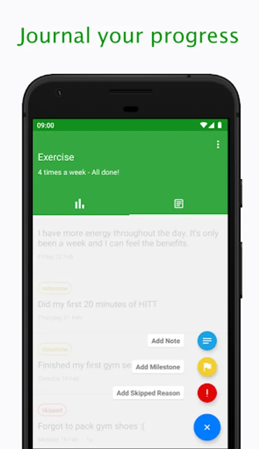 You can add 3 different types of notes. General notes for anything that’s on your mind. Skipped notes help you keep track of why you’re not completing a habit. And milestones to celebrate your success. These 3 notes gives you the self-awareness and reflection to develop a powerful habit or break a bad one.