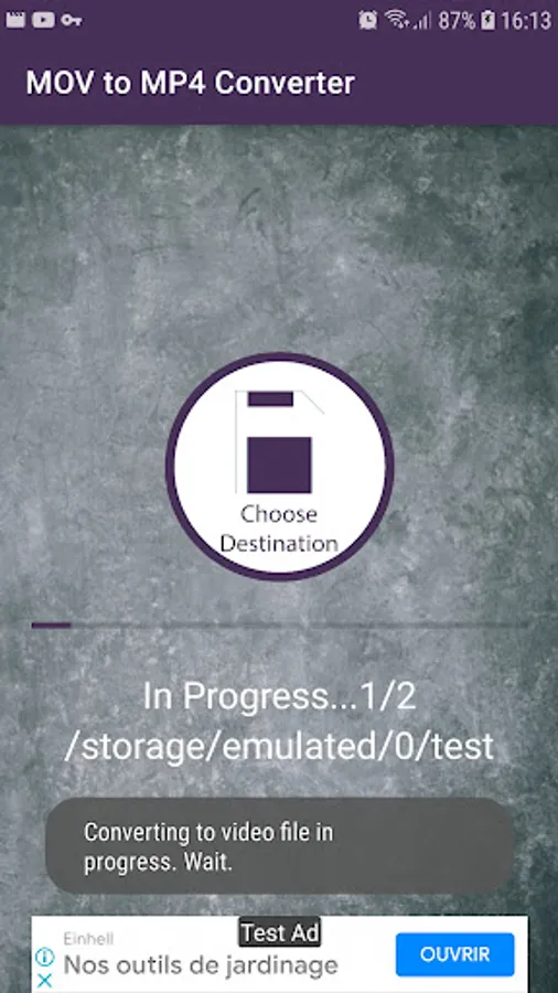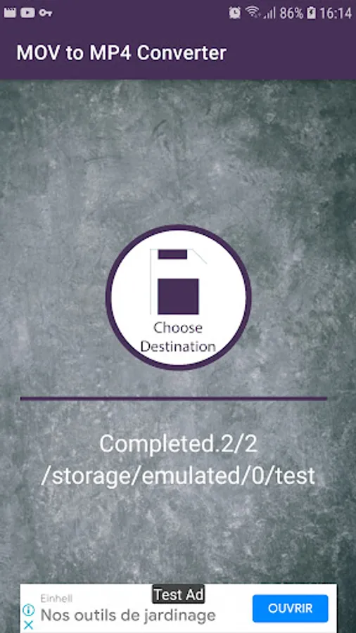 After choosing destination folder, converting progress bar is shown. When it is done, text 'Completed' is shown.