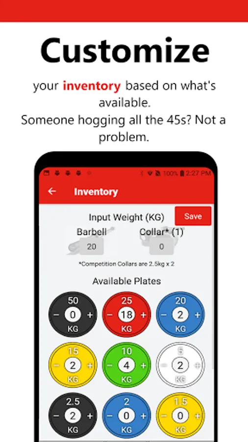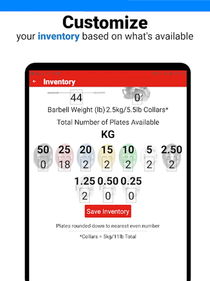 - Customization of inventory (barbell, collars, # of plates available)