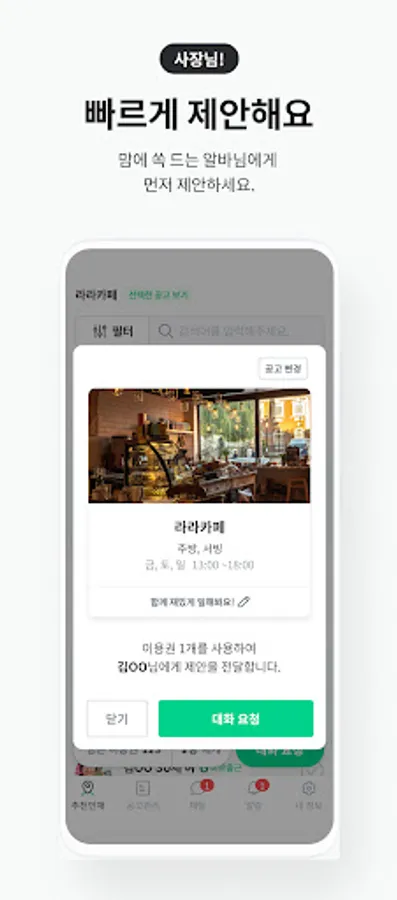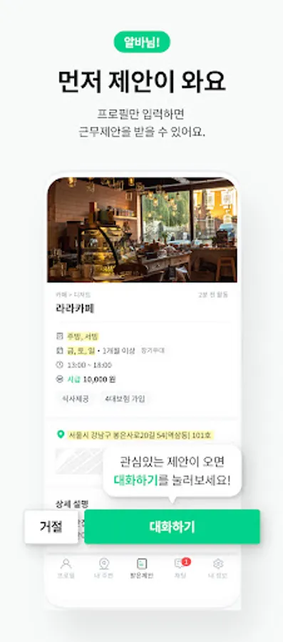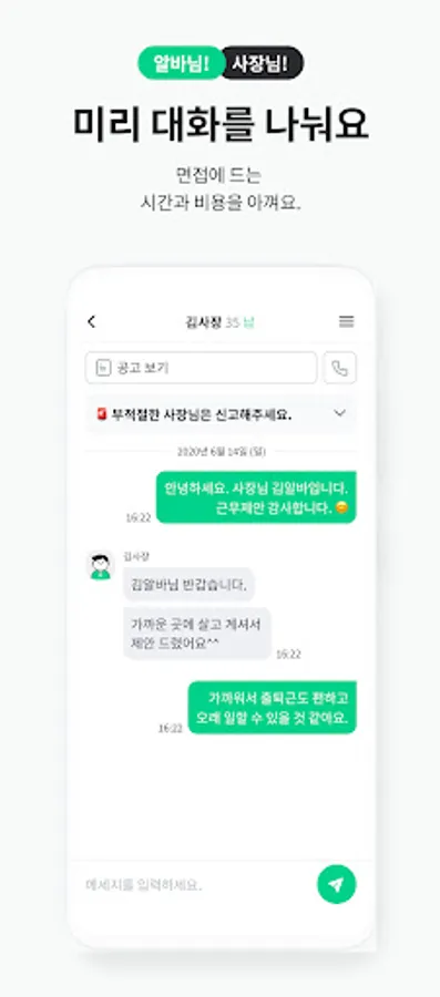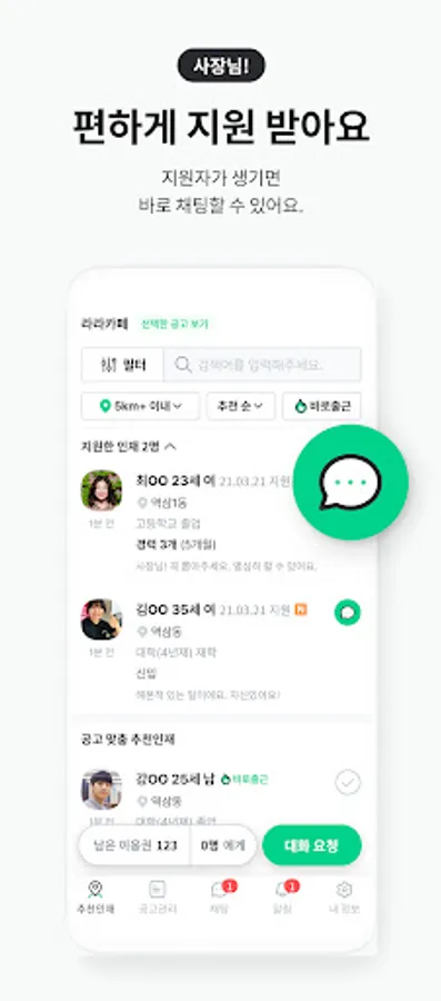 Stop talking through text, KakaoTalk, etc.! You can chat with the boss without feeling burdened through the chat function within the app. Chat conveniently through the app and save time and money on interviews!
