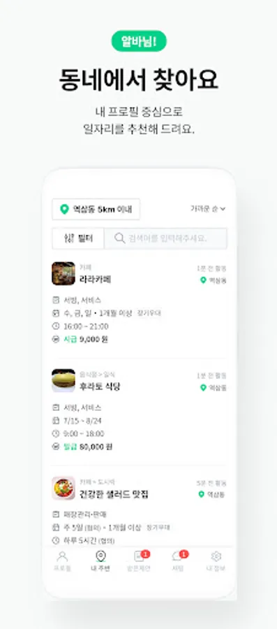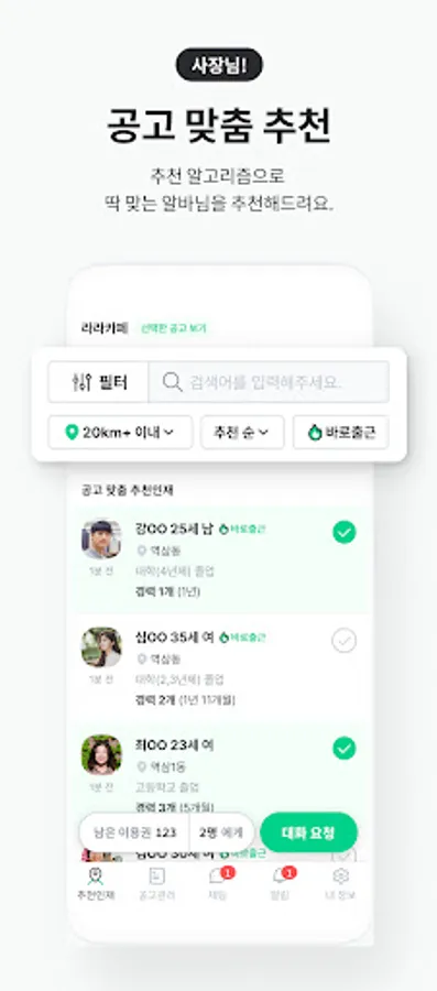 Directly connect to part-time jobs in your neighborhood with a list of recommended part-time workers! You can conveniently find part-time jobs by providing a list of nearby part-time jobs based on your profile. You can easily search for part-time workers with the conditions you want, and with an accurate matching rate, both the boss and the part-time worker can find a job happily!