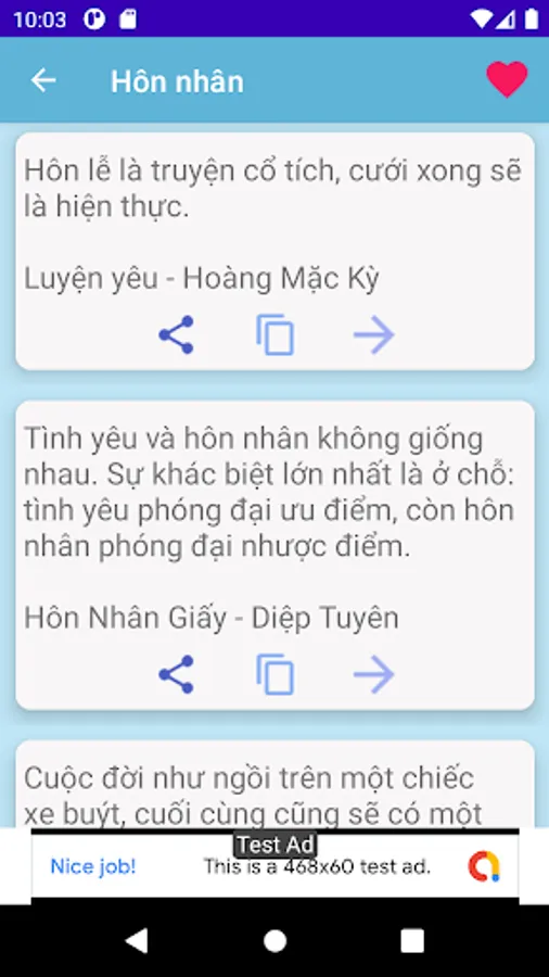 The application helps readers feel and share good sayings in love stories. The sayings full of mood and meaning of the characters are collected in love stories. You can use it to share on social networks as status lines or mood posts to express your thoughts or express your feelings and feelings to your friends. These sayings are divided according to the topics of marriage, happiness, family, love, making it easy for you to choose according to the topic you want.