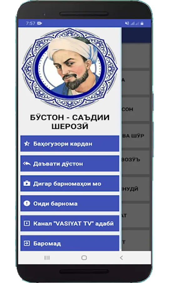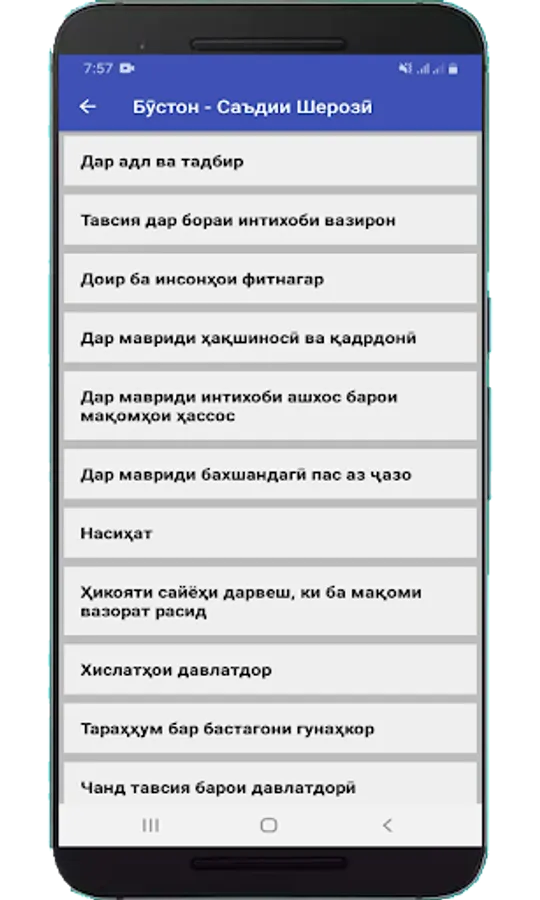 Bad az khaftsad sol "Buston" -i ҳameshasabzi Shaykh Saddi nakhustin bor kaboi tozai nasrī ba bar kard wa in amalu khunari volo die digare ba die he bipaivast. Umed dorem, ki honandagoni nuktasanji tojik va forsizabon in asari arzishmandro bo ikhlosu samimiyat mepazirand.