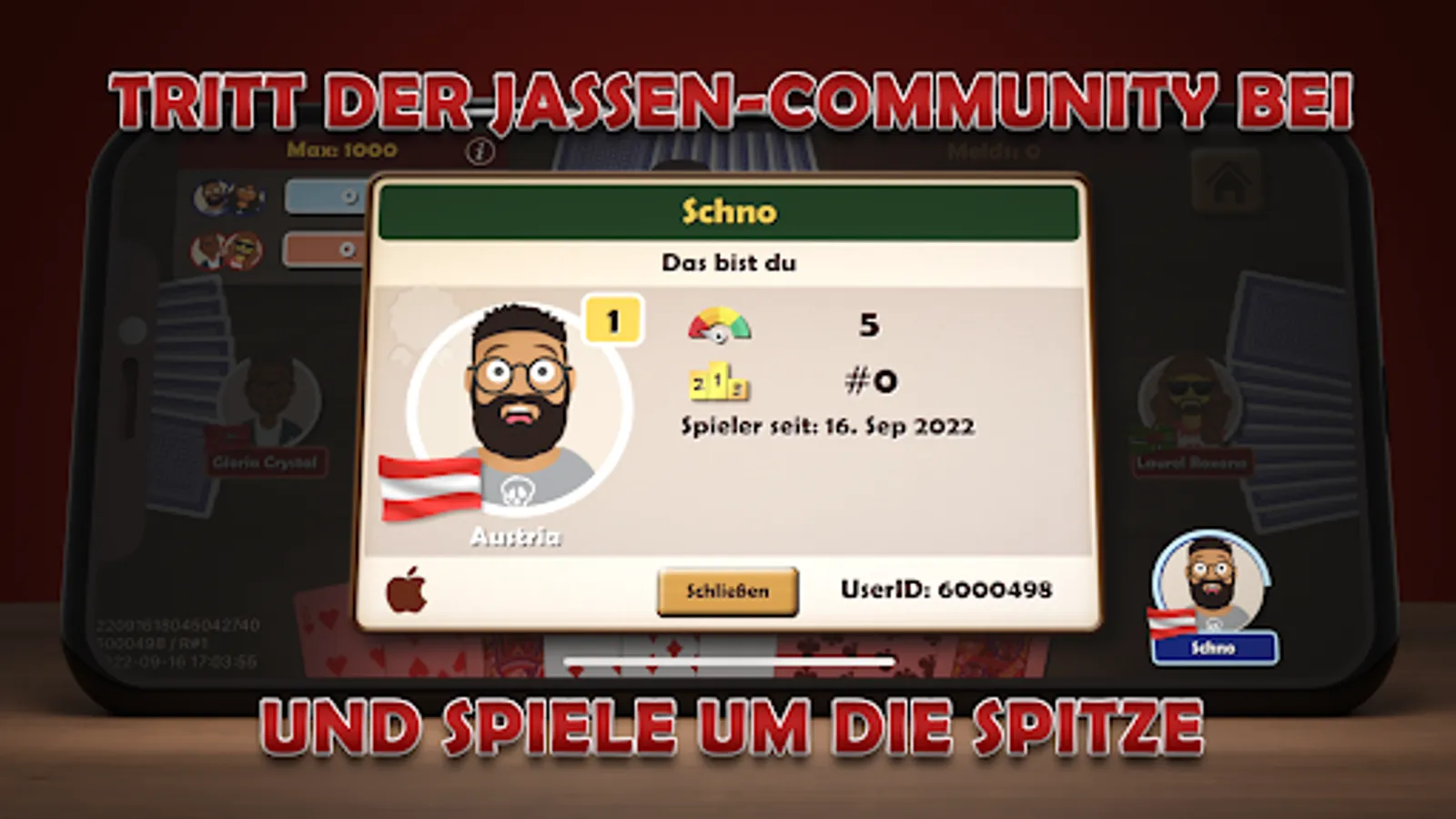 Enjoy games with friends on almost all smartphones and tablets or meet new people for multiplayer card games in the chat. Thousands of Jassen players are ready for a round of mobile Jass anytime, anywhere.