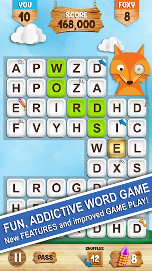 In Words with Foxy you find words to claim tiles. Each letter used in a word will turn your color. Foxy will make words as well and turn the tiles to his color. There's no time limit, just turn for turn to see who can make the best words and own the most tiles at the end of each level. You need to beat Foxy in order to progress to the next level and there are plenty of levels to keep you occupied!