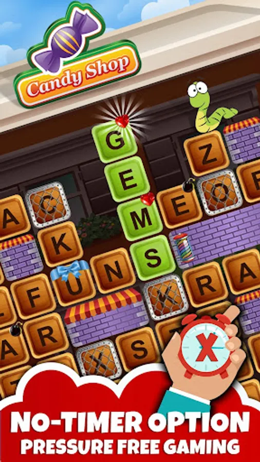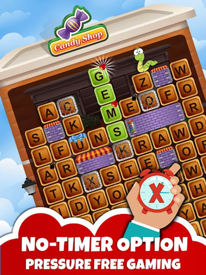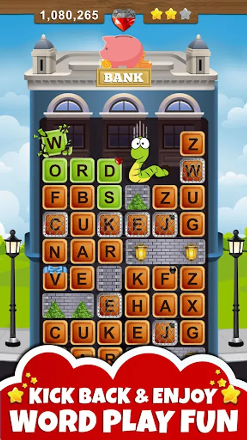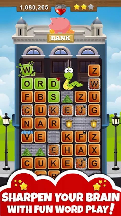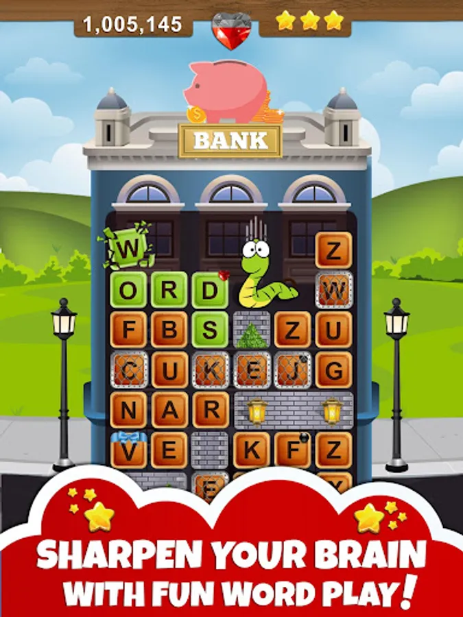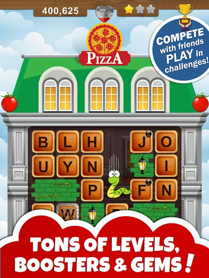Choose each letter strategically and use all the tricks in the book to collect extra points and stars. Find bombs 💣 to clear a path for the worm! Collect gems 💎 to unlock bonus word game levels.