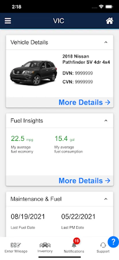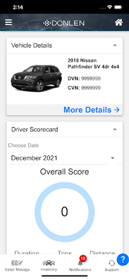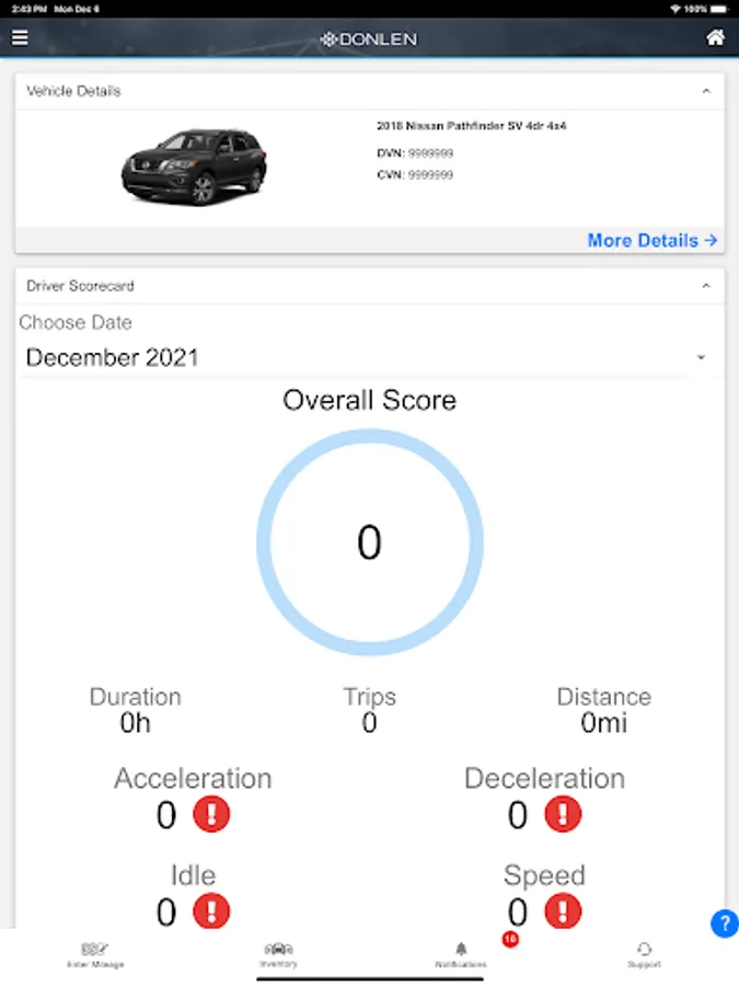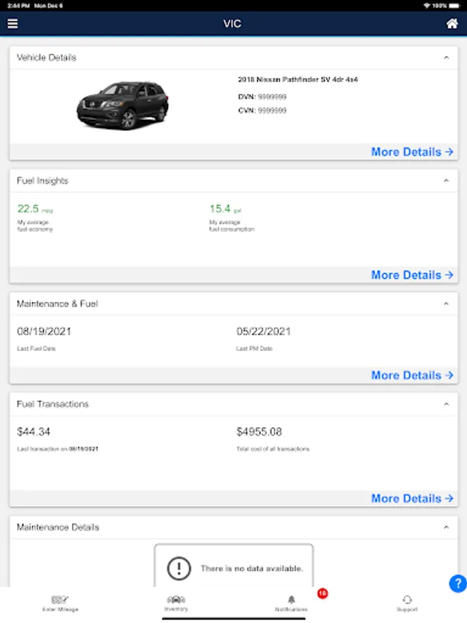 • Vehicle Info – Provides an overall snapshot of the driver's current information. Information includes Maintenance & Fuel Detail.