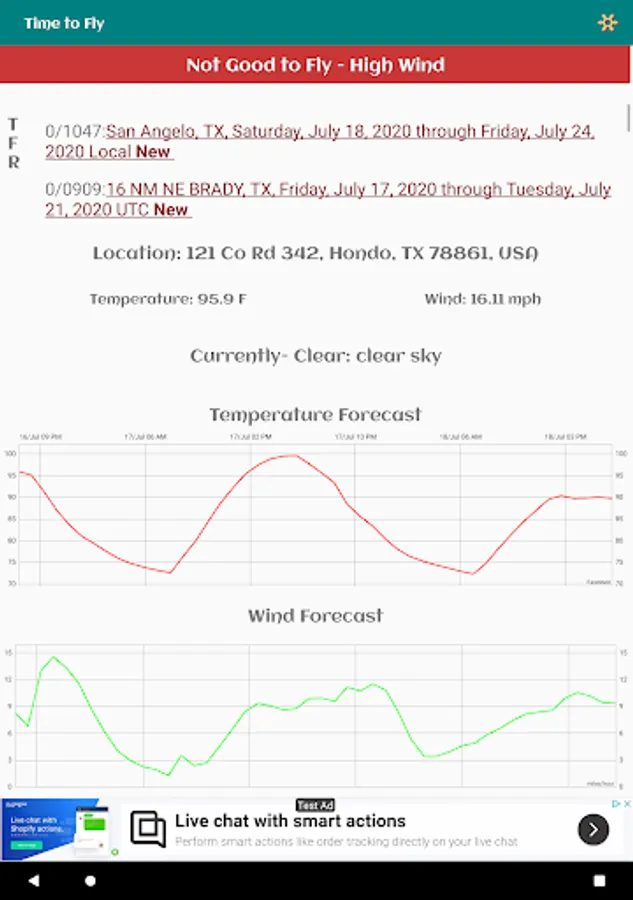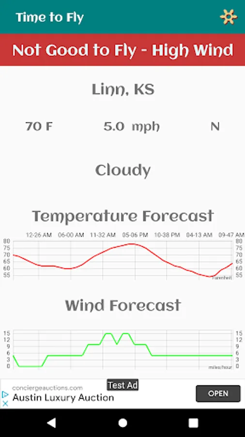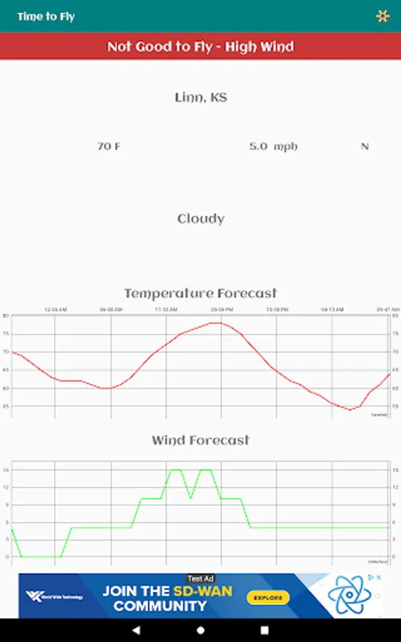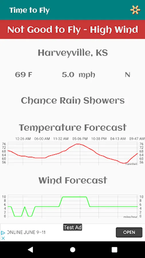 Set the alert wind and temperature to see if it is good to fly at your location. Provides forecast for the next 12 hours with both wind and temperature.