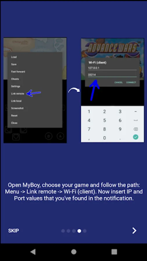 Remote Linking for My Boy! is a companion app for My Boy! and My OldBoy!. It can be used to remotely link My Boy! emulators or My OldBoy! emulators.