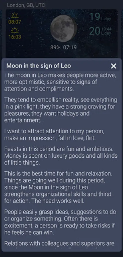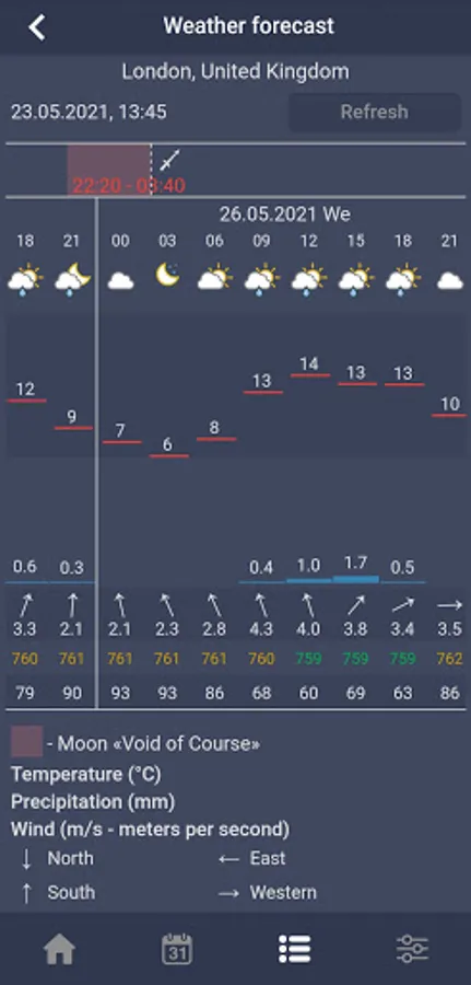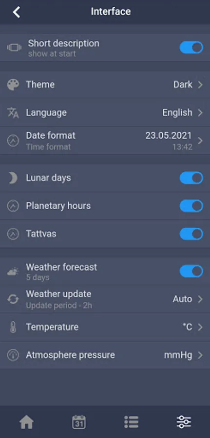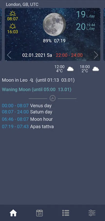 On separate pages there is information about the events of the moon for a month, a weather forecast for 5 days, planetary hours and tattvas.