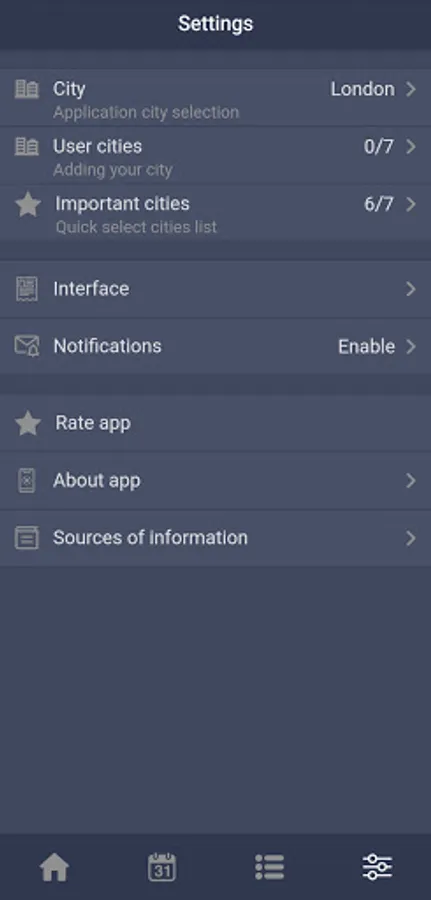 The time of events is automatically calculated for the selected city, taking into account the time zone and daylight saving time.