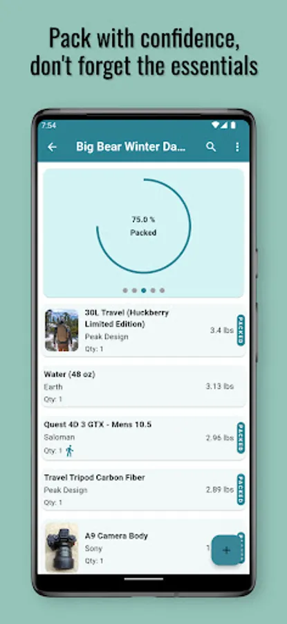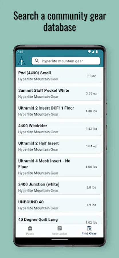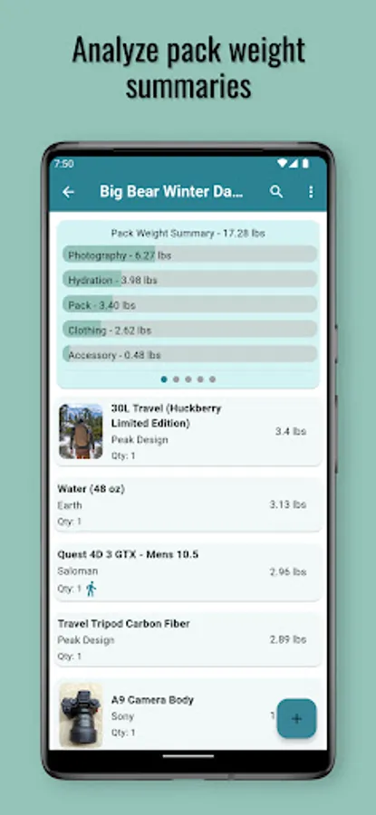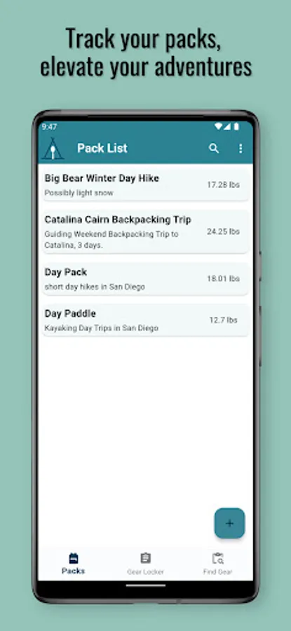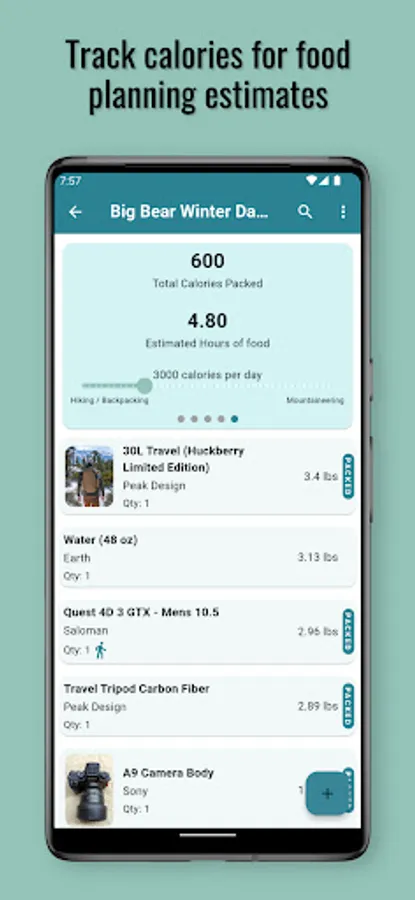 Add your gear to your own packs to see pack weight statistics and calorie tracking.