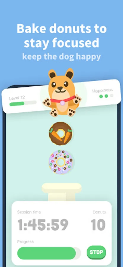 Do you struggle with phone addiction and distractions? Our productivity app is here to help! With our Pomodoro timer, you can focus on your important tasks while building healthy habits. The app's donut machine allows you to produce donuts for your virtual dog, Focus, who needs to be fed regularly.