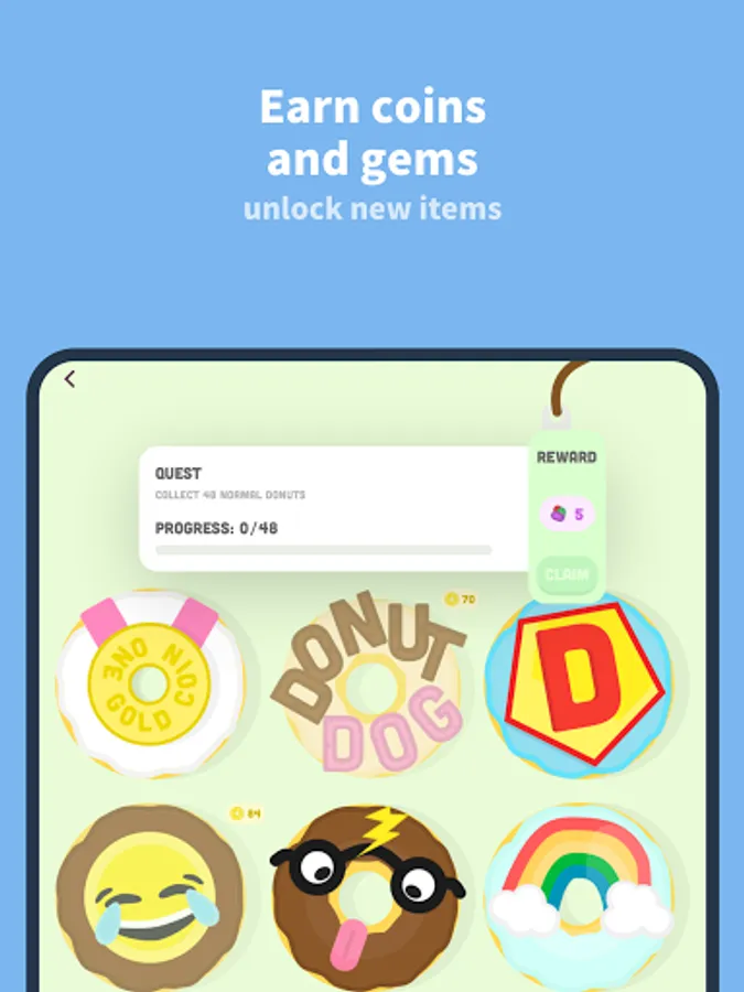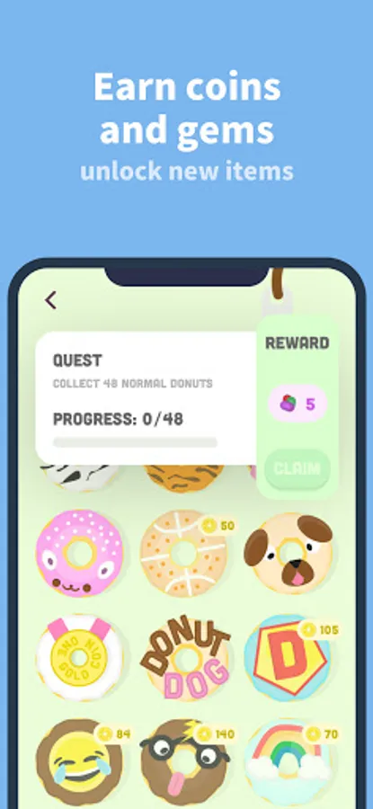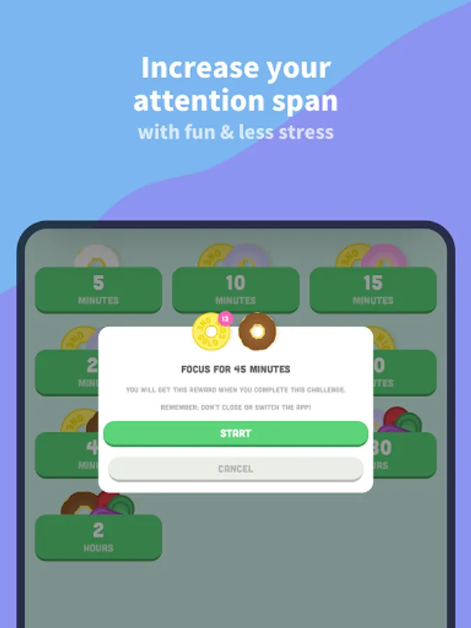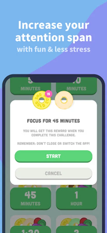 1) Start a focus challenge with our gamified productivity app and earn rewards such as donuts, gems, and coins.