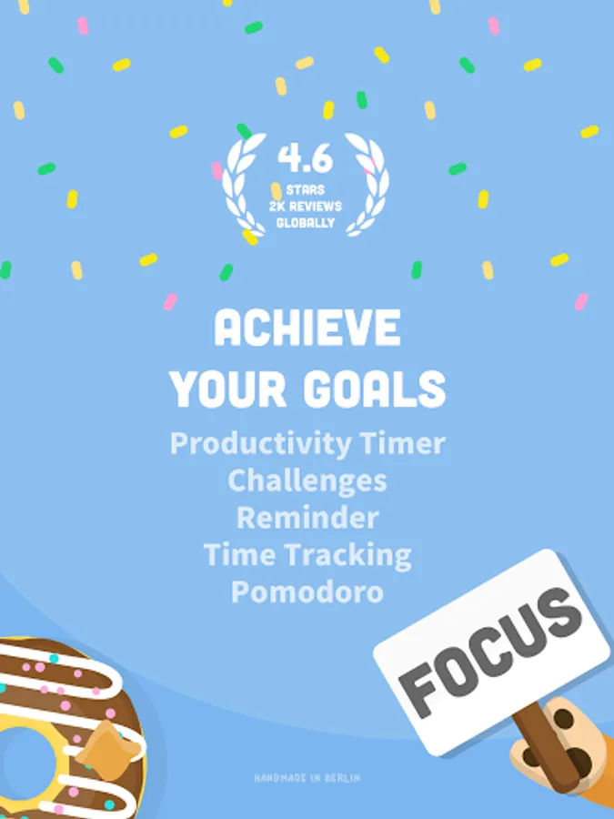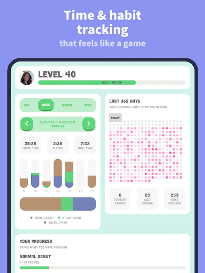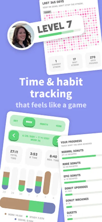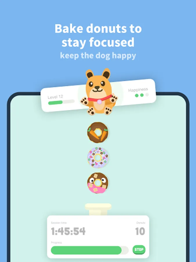 But beware of distractions! If you leave the app, your donut machine will stop. The sense of achievement and responsibility for Focus will motivate you to stay away from your phone and get more things done. Your progress is displayed with detailed statistics that help with time management and reduce screen time.