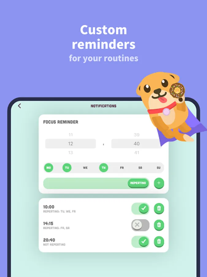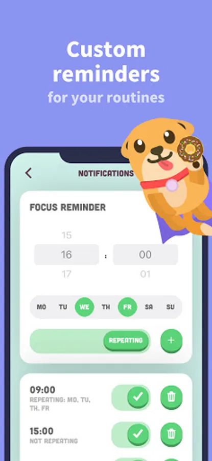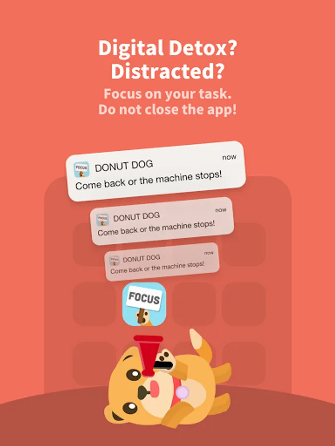 2) Build the habit of responsible phone usage by feeding your virtual dog named Focus with donuts. Earn coins and XP for each feeding.