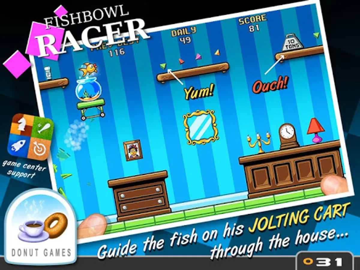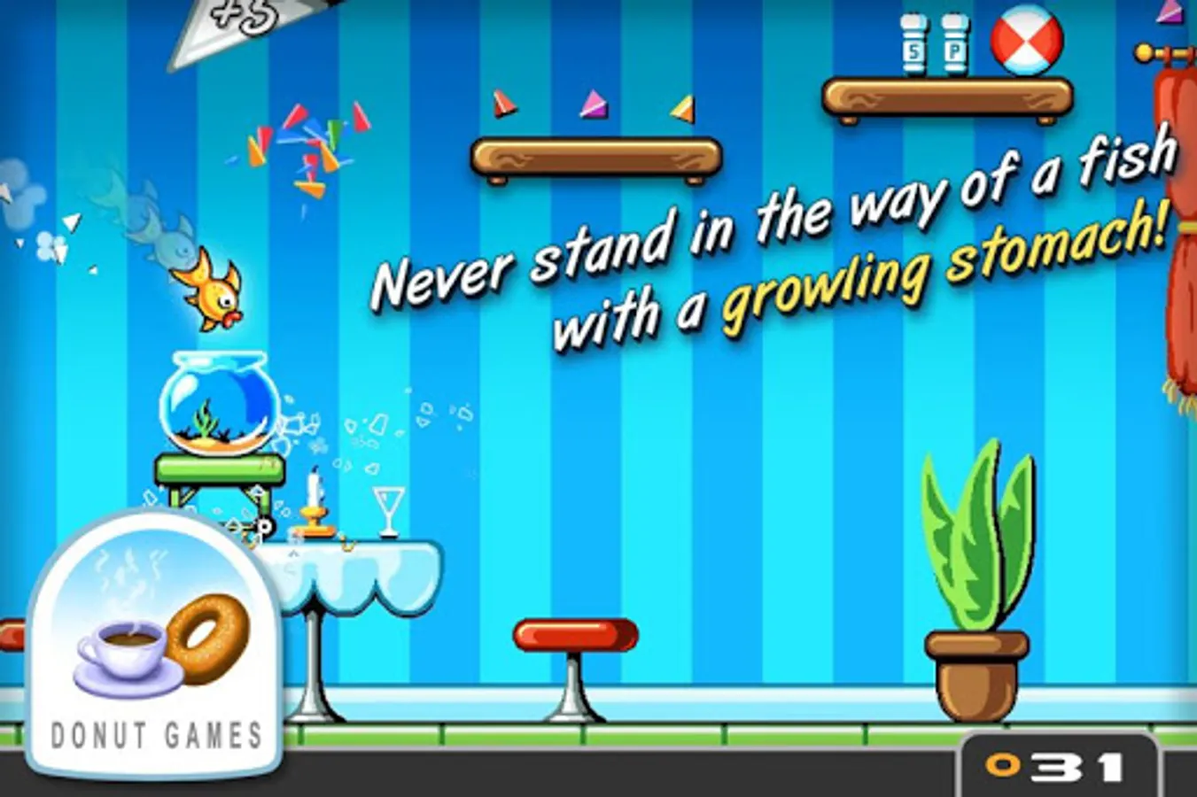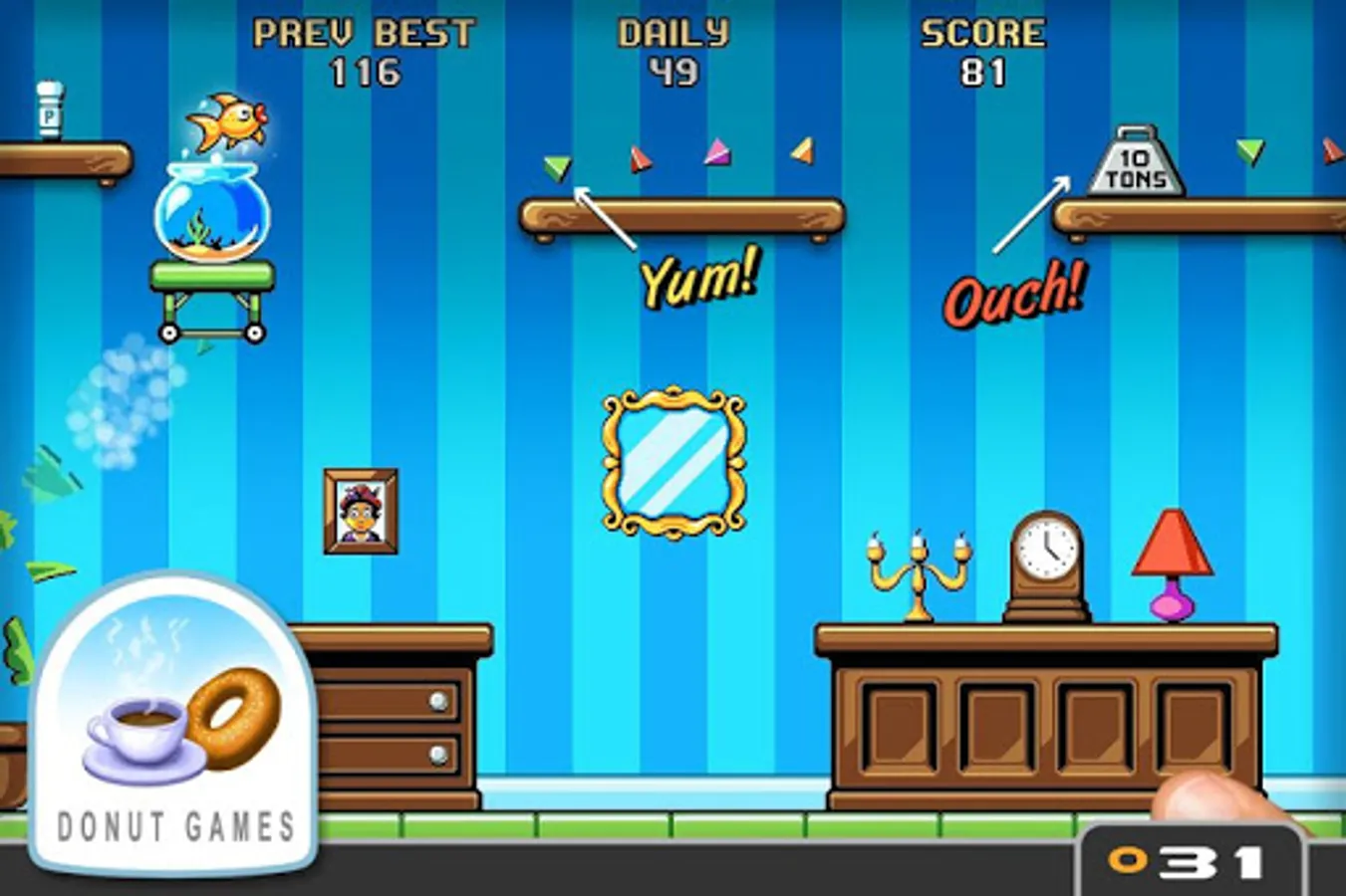 Control a fishbowl on top of a JOLTING CART, and a starving GOLDFISH trying to snatch fish food from the shelves, both at the same time!