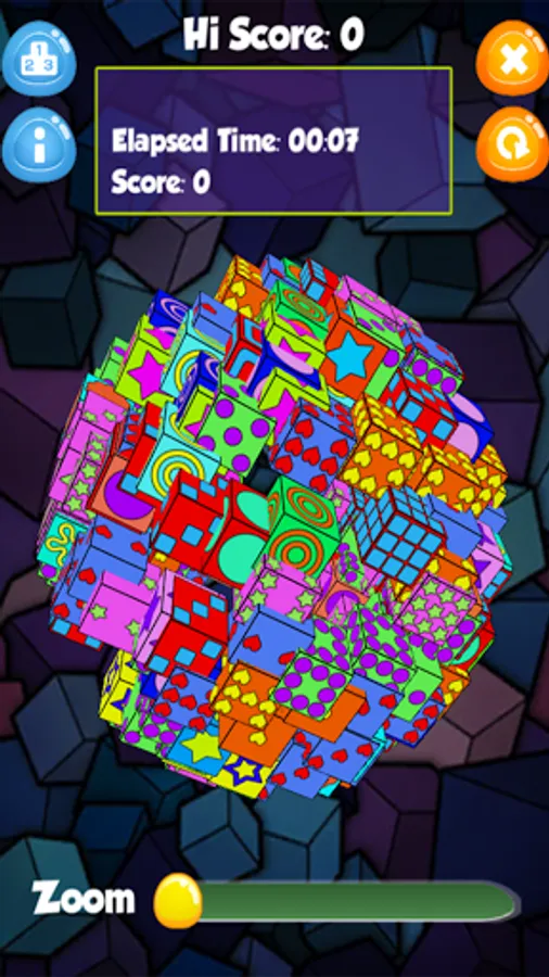 Cubeology is a 3D Match 2 cube matching puzzle game in which you select pairs of cubes with matching designs. When you match two cubes with the same design they are removed, and you continue to match 2 cubes at a time until all the cubes are gone, either for points or against the clock.