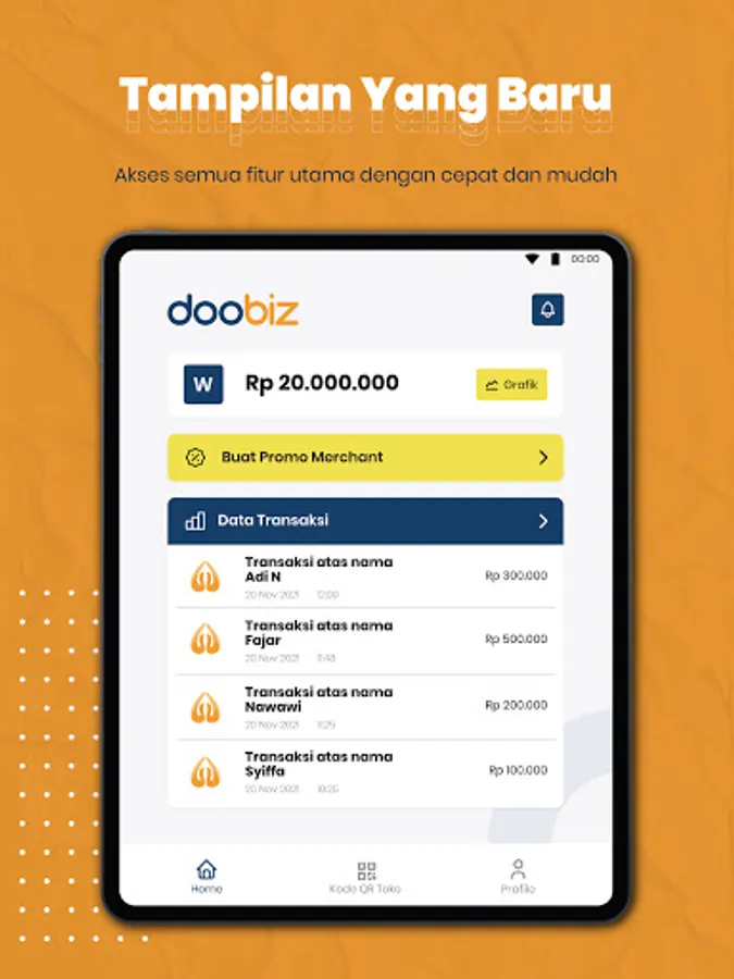 doobiz is a Financial Technology (fintech) application that is present as a digital (non-cash) transaction solution intended for business people. Doobiz makes it easy for business owners to view transaction details and access the QR Scan that is present to speed up transactions with customers.