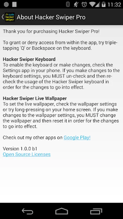 To enable the keyboard or make changes, check the Settings app in your phone. If you make changes to the keyboard settings, you MUST un-check and then re-check the usage of the Hacker Swiper keyboard in order for the changes to go into effect.