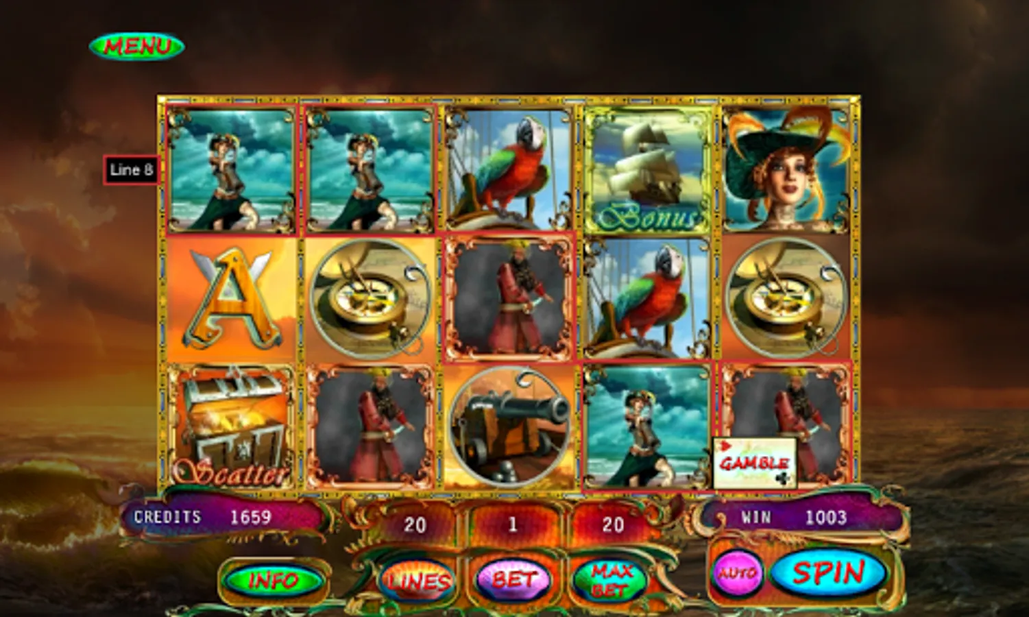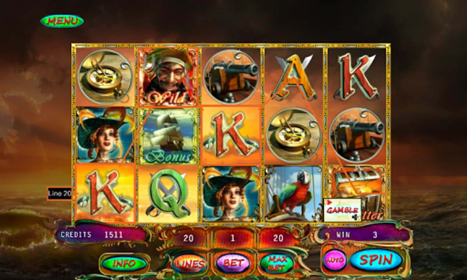 Chances to find hidden treasures the greater, the wider area searches. Regulate coverage possible by activating a different number of paylines. Change the number of lines you can not just before the game, but at any time at the request of the player. Another option, which should set the player - a bet on the line. The selected size of the bet multiplied by the number of active lines. The total bet is displayed in a window at the bottom middle panel game. To the left of it in the same window shows the current balance in the account of the player. Right displayed size of the prize with a winning combination of symbols. You can play the game in two modes - manual and automatic. In manual mode, the player must start each round drums by pressing «SPIN». To transfer the game to the automatic mode must be pressed once the button «AUTO». Drums will spin round for round and won the money at once to enter the balance of the player. In the «INFO» lists all the winning combinations of symbols and the size of the prize for each of them. As soon as one of these combinations on the reels stop, the player has the full right to take the money and continue the game. Instead, he can take the risk and try to increase your winnings many times over. For this pirate treasure slot machines have a special free risk game. If the player agrees to take the risk, he presses the button «GAMBLE», and appear on the screen five playing cards. One of them is open. It is the dealer's card. The other four are face down. The player selects one of the four maps and compares it to the dealer's cards. Whose card will be over, and he won the current round. If the player was lucky, his prize will be doubled, and it has the right to continue risk-game. If luck is on the side of the dealer's, the player loses his prize, and returned to the main game. Slot machine Pirates Treasure free hides a few bonuses. Among them are traditional for virtual slot machines preferences and rather unusual surprises. Symbol Wild («Pirate") substitutes for any other symbol, missing the prize combination. This interchangeability significantly increases the frequency of loss of prize combinations, and hence profits Player. Three, four or five symbols Scatter («Treasure Map") simultaneously on the reels open 10 free rounds of the main game. At this time, the player does not spend money on bets, but all the prizes that fell during this time, come to his account. But the most interesting and unexpected bonus the player gets when during the free spins in the first and fifth reels at the same time the characters will fall Bonus («Ship"). It marks the beginning of the bonus game called "The Pirate Bay".