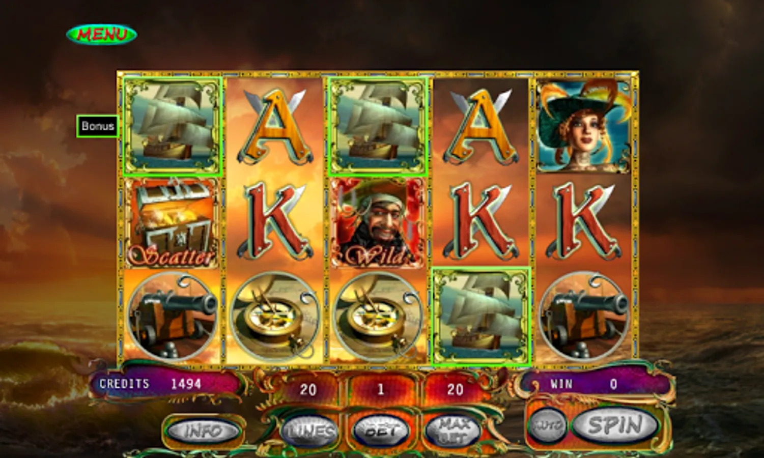 Dashing raids, boarding, a fierce battle under the "Jolly Roger" ... At one time it was the surest way to fill the pockets of hard cash. Since then, all near and far islands of the Caribbean countless hidden pirate treasure. They are still waiting for brave adventurers. Today, to get to the old caches, enough to climb aboard one-armed bandit «Pirate Treasures» and go to meet their wealth. Well, are you ready? Then go ahead, run slot machine Pirate Treasures Slot. Pirate Treasures Slot Machine has the following features: 5 reels, 20 lines, the maximum line bet 100 units.