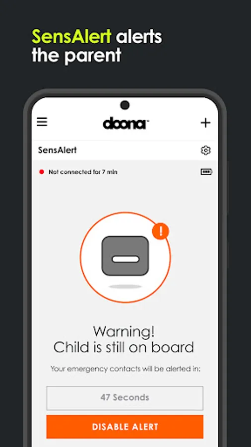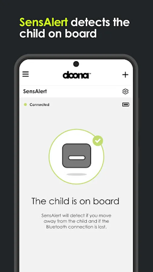 The Doona app connects to SensAlert, the only child car seat alert solution with 3 alert levels. SensAlert detects the child on board and warns the parent or caregiver with three incremental levels of alarm if the child is left unattended in the car. If the alerts are not disabled, SensAlert will contact up to 5 emergency contacts that you have defined in the app.