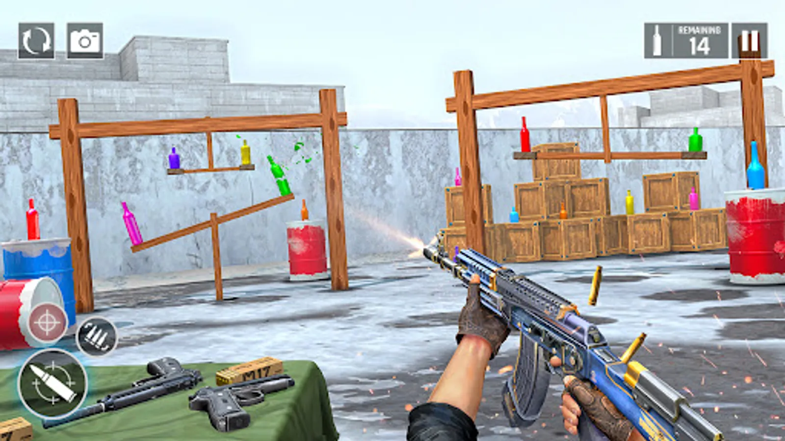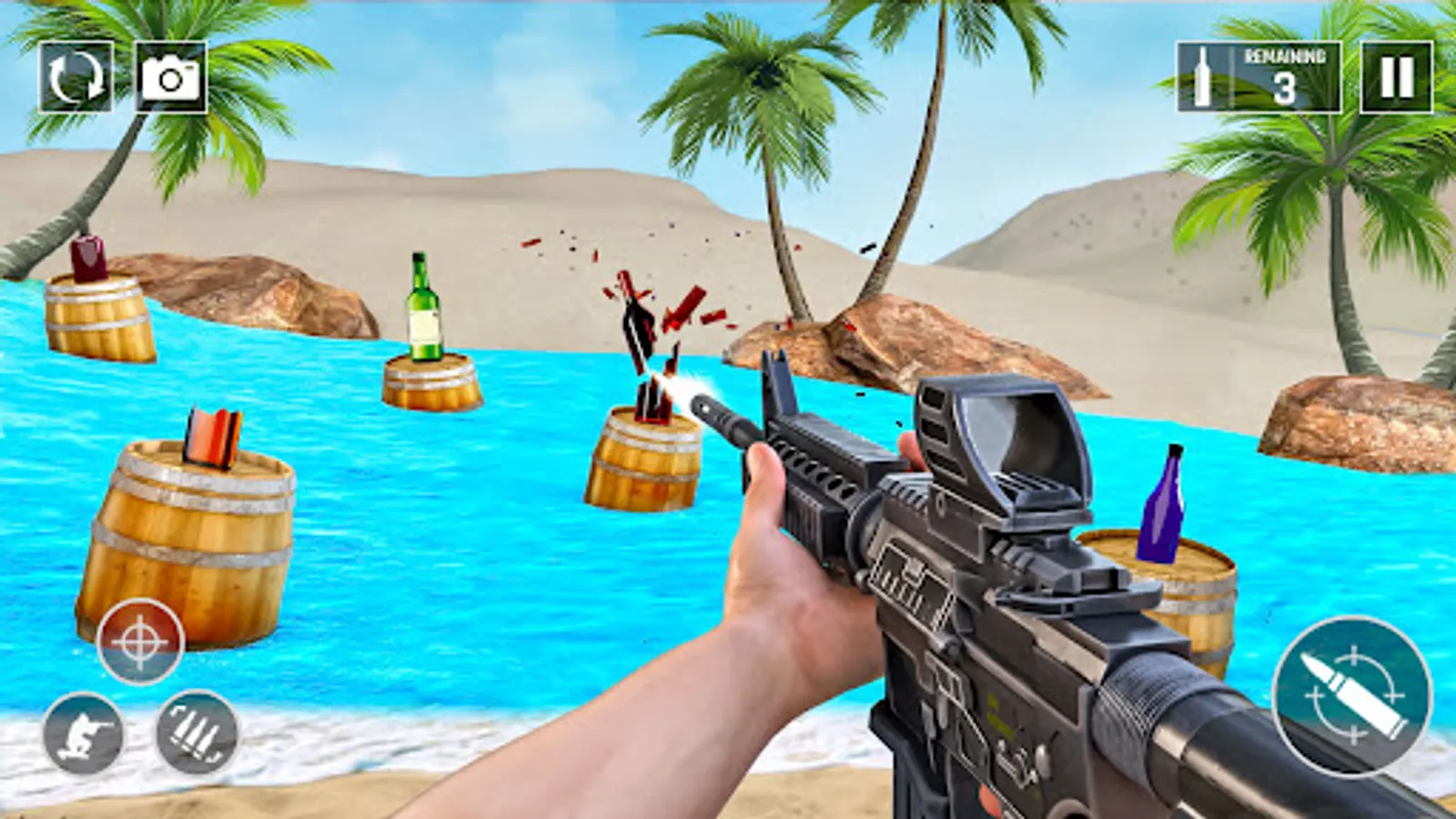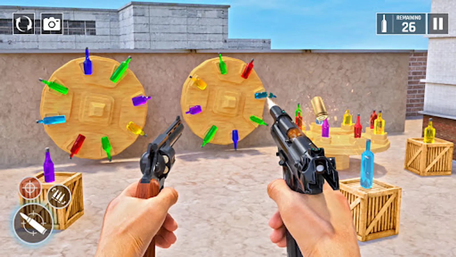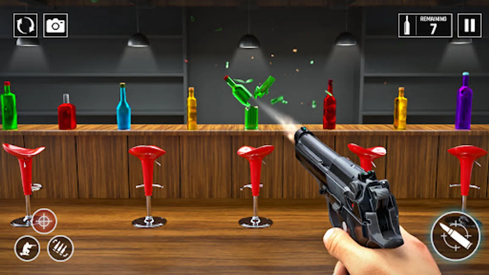 You get a hefty reward as you knock down bottles in free shooting games. You can buy more powerful weapons to make the new bottle shoot game easy and fun. The player can also claim a free reward daily, only to continue the streak of bottle shoot.