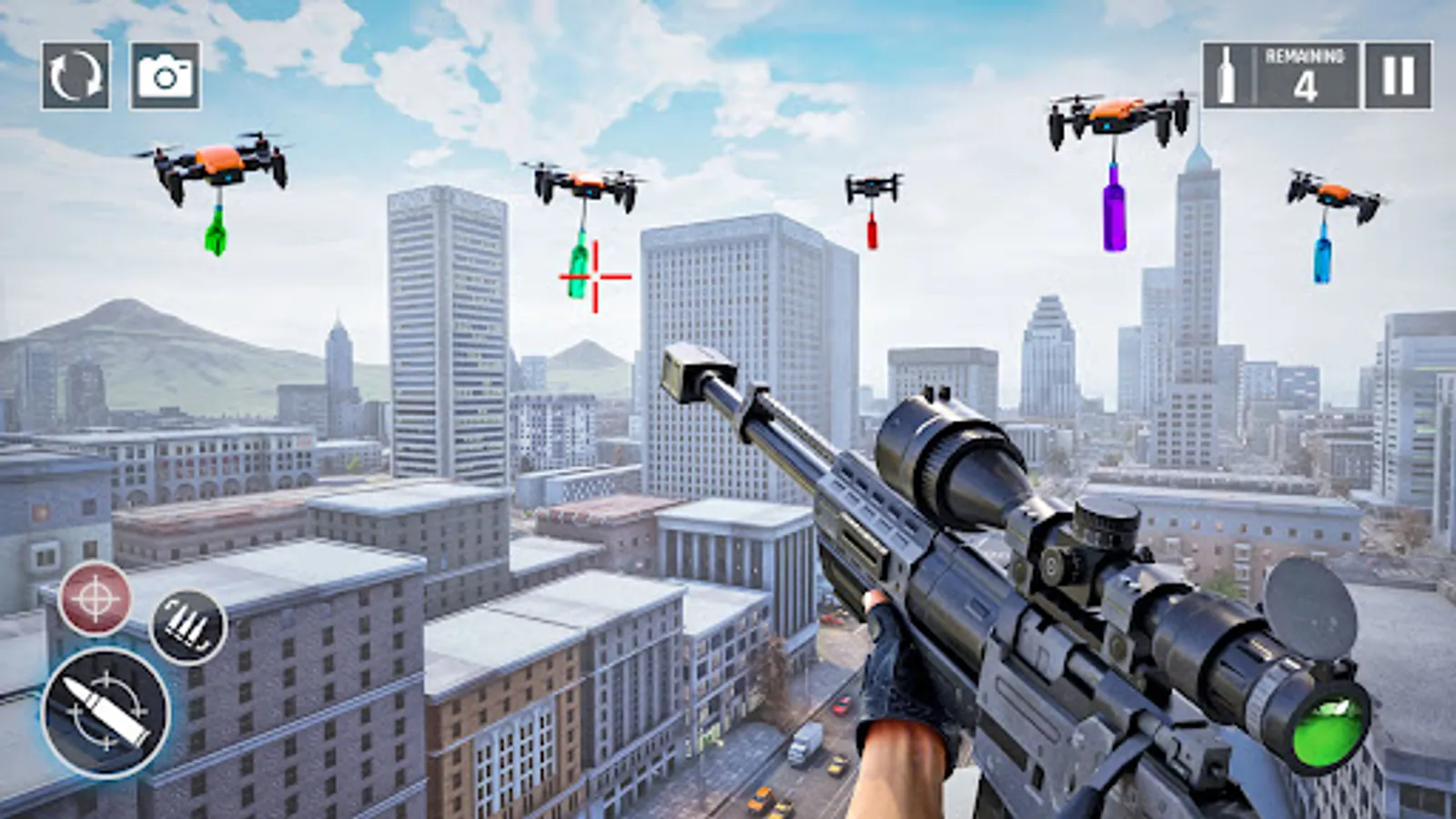 In this bottle shooting game, you will be aiming at your target and then press the fire button to knock down bottles precisely. The free bottle shooting game comes with an aim down-sight as well. This aim sight makes taking your targets easy so you can knock down bottles. To switch between targets, swipe on the screen and tap to shoot bottles, and stack up your score.