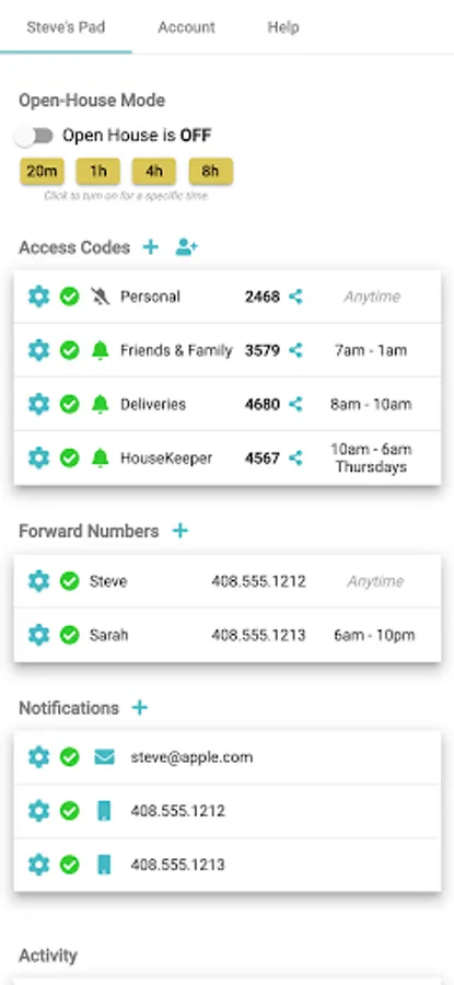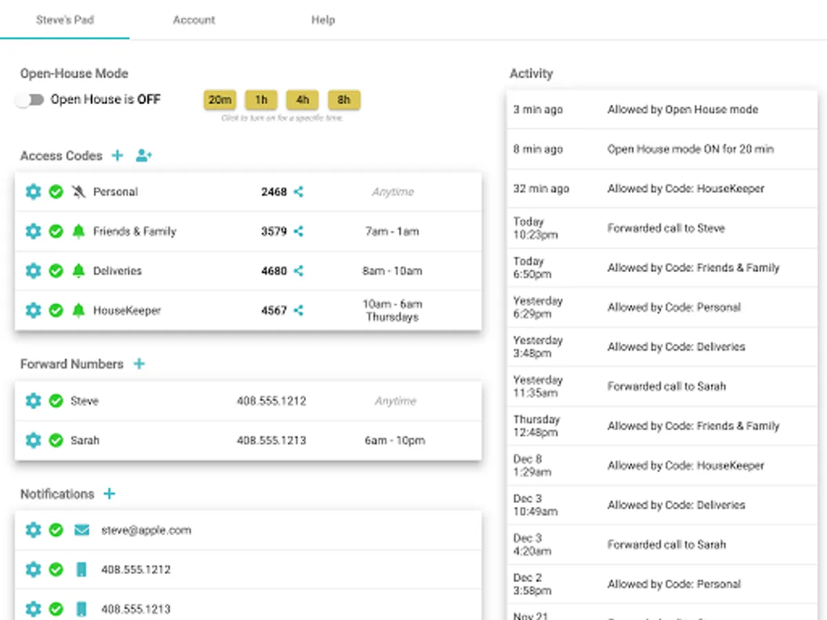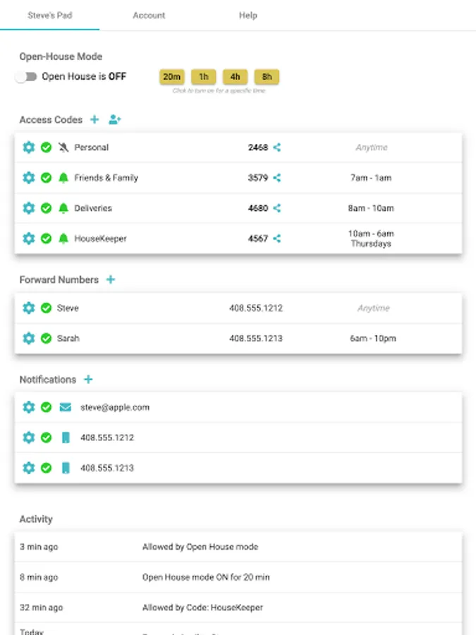 - Create & share Access Codes to give to your Family & Friends, or housekeepers, tradespeople, etc.
